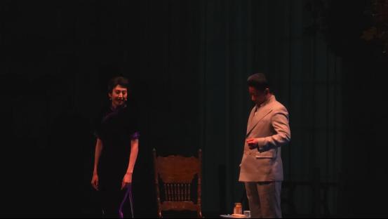舞台上的作家张爱玲,由浙话青年演员王荷饰演,剧中的她一袭旗袍,优雅妩媚,其逝去岁月的风姿伴随着张爱玲的经典名篇、经典名句呈现在观众面前,令人动容。