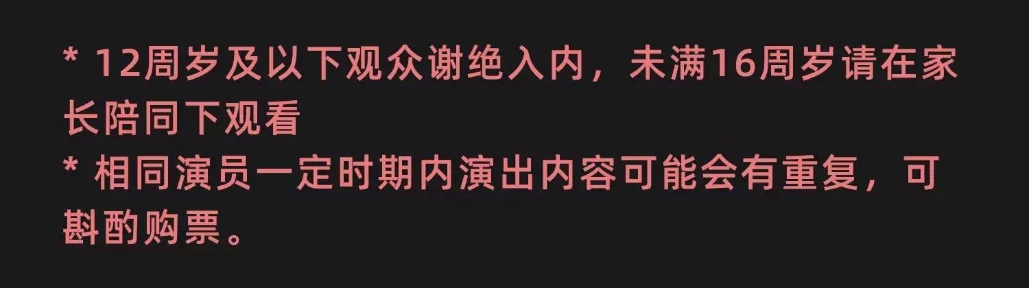 | 儿童入场提示 | 12周岁及以下观众谢绝入内,未满16周岁请在家长陪同下观看。 | 禁止携带物品 | 食品、饮料、相机、充电宝、打火机等 |