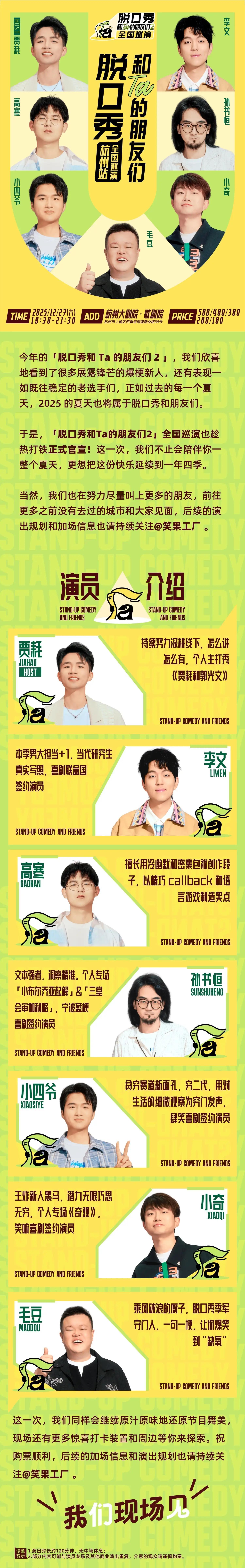 | 限购说明 | 每单限购6张 | 重复购票说明 | 同一位“实名观演人”请勿在多个售票平台重复购票,一位“实名观演人”的身份信息对应同场次的一张门票。 若同一位“实名观演人”被发现存在多个购票平台购买同场次行为,由该行为产生的无效重复订单、退票手续费、过期不可退票、无法入场等所有损失,均由购票人自行承担。 |