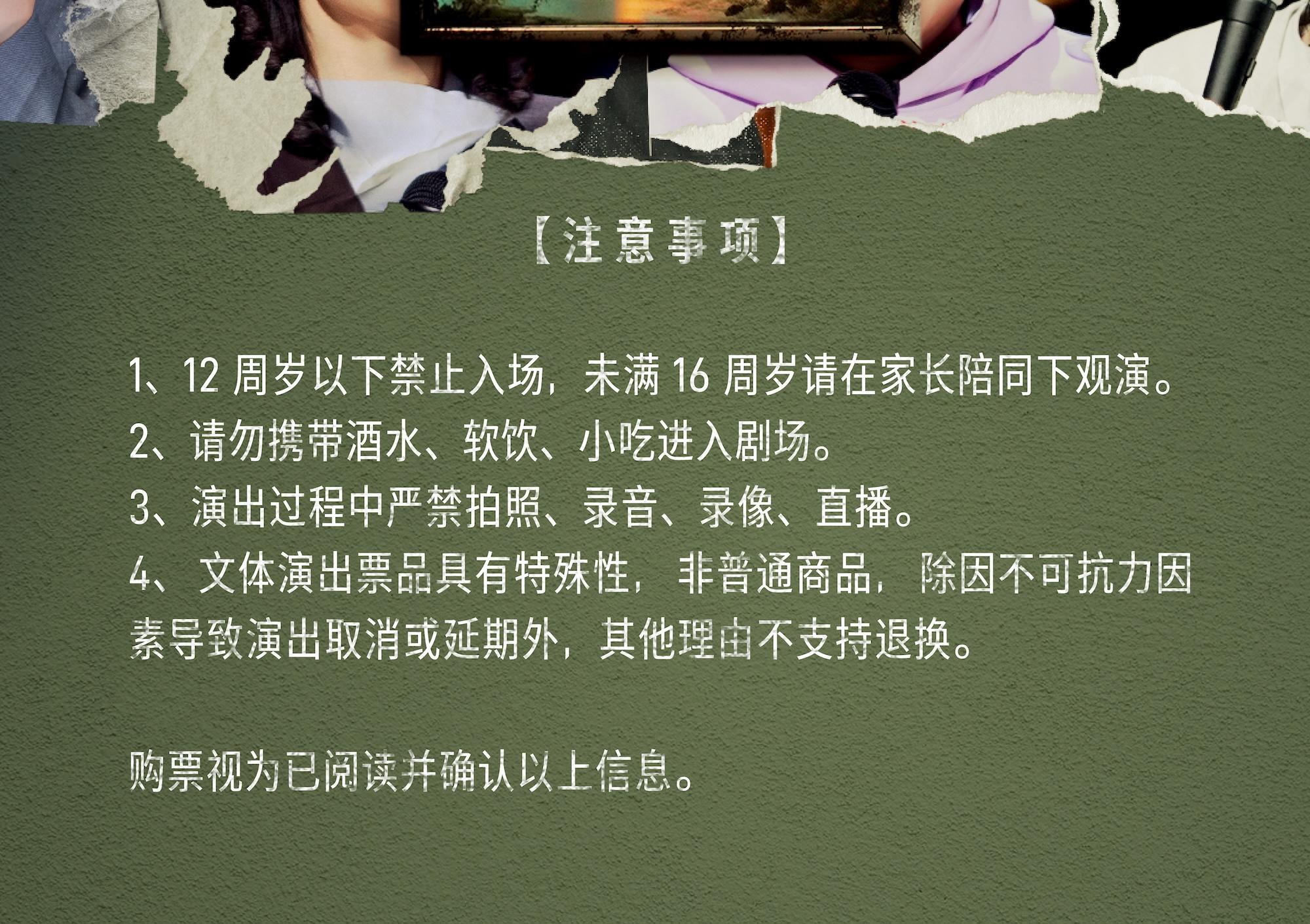 *为保障观众的消费权益,购买池座(一层)、二层、三层门票的观众仅能凭票进入对应楼层,对号入座,严禁跨层入场。请观众提前半小时入场,每人一券,12周岁以下儿童谢绝入场。