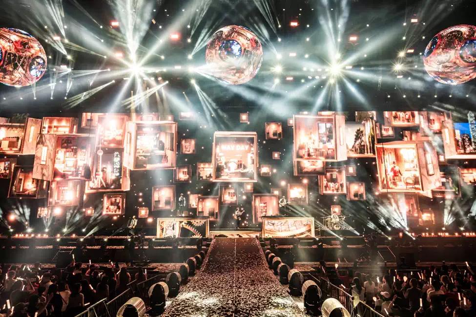 五月天在出道满25周年的重要里程碑,从舞台到曲目都紧扣一路以来的音乐轨迹,歌单集结第一张《五月天第一张创作专辑》到第九张《自传》的代表作,每一首都足以代表「每个人心中都有一首五月天」。舞台携手必应创造、仙草影像再次打造「5懈可击」的音乐、声光、视讯飨宴,主舞台上巨大LED球型的「天外有天时光机」,另有五颗飘浮「神的孩子都在跳5球」做视觉延伸,共使用了15,640片特别订制特殊规格的360度环绕三维曲面球体LED显示屏组合而成。视觉系统的规划,以Disguise多媒体伺服器整合输出相当于整体宽面为16K像素,呈现最精致画质,创造出「5与伦比」视听觉的完美效果,成为极具纪念意义的动人演出。