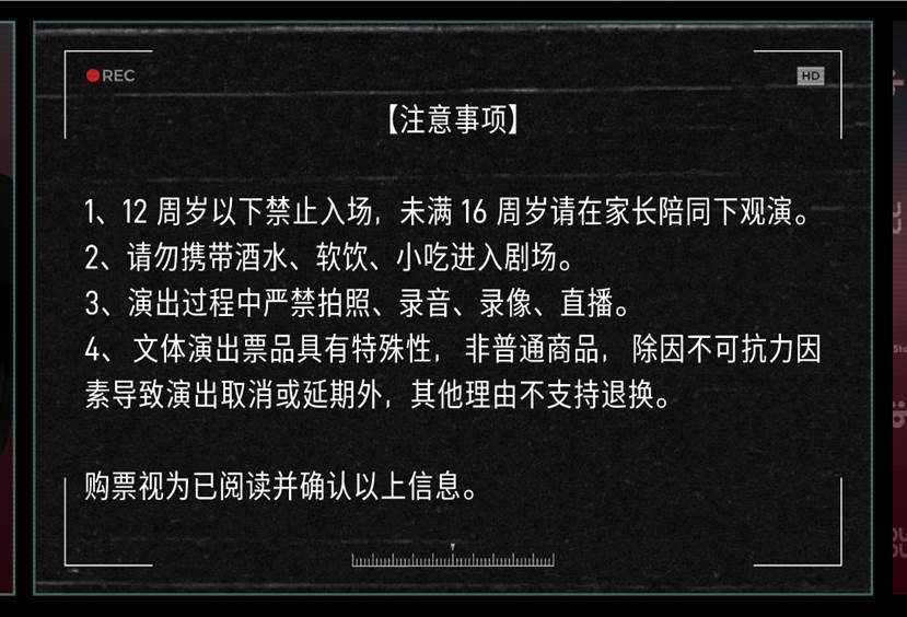| 儿童入场提示 | 12周岁及以下观众谢绝入内,未满16周岁请在家长陪同下观演。 | 禁止携带物品 | 食品、饮料、相机、充电宝、打火机等 |