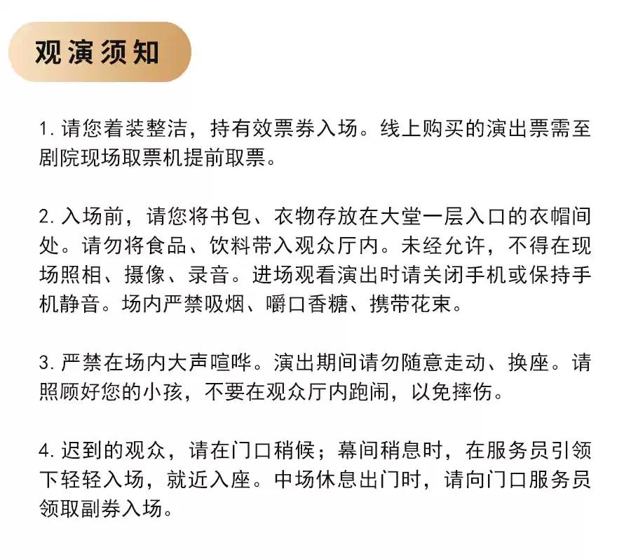 | 电子票 | 本项目支持凭电子票入场。 -请至少提前一天购买,开演前24小时内,票牛会发送取票短信,请按短信提示内容取票。 |