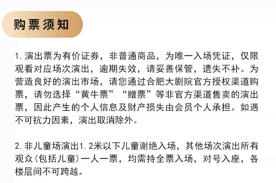 | 重要提示 | 演出现场气氛热烈,请您务必根据自身身体状况酌情是否购票参与观演,特别是患有心脏类疾病、急性心脑血管疾病、心肌炎、高血压等相关疾病的人群,请您务必遵照医嘱,结合病史及个人身体状况进行观演,观演期间请自行承担身体健康相关责任。 | 温馨提示 | 购买前请您提前规划好行程,做好相应准备,以免影响您的正常观演,感谢您的理解和配合。 若演出受不可抗力影响延期或取消,票牛将对演出票订单按照项目官方通知方案进行处理,其他因观演发生的费用需由您自行承担。 |