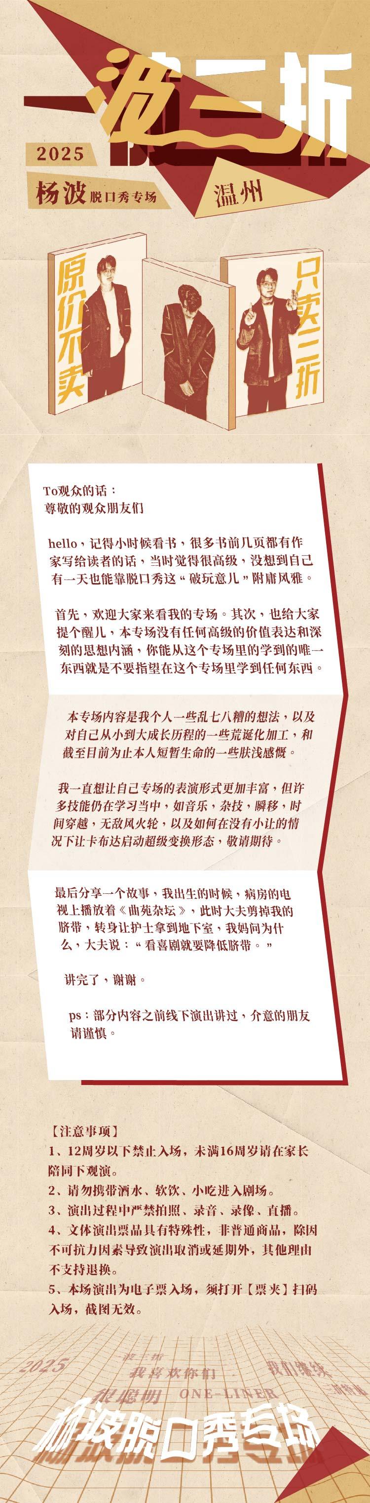 | 温馨提示 | 购买前请您提前规划好行程,做好相应准备,以免影响您的正常观演,感谢您的理解和配合。 若演出受不可抗力影响延期或取消,票牛将对演出票订单按照项目官方通知方案进行处理,其他因观演发生的费用需由您自行承担。 | 实体票 | 本项目支持凭实体票入场,支持以下取票方式: - 快递配送:运费10元(V4及以上会员包邮),顺丰发货。 - 现场取票:票牛工作人员将在演出开场前1小时至现场派票。工作人员联系方式、具体取票地点将在演出当天以短信通知发送至预留的手机号。 |