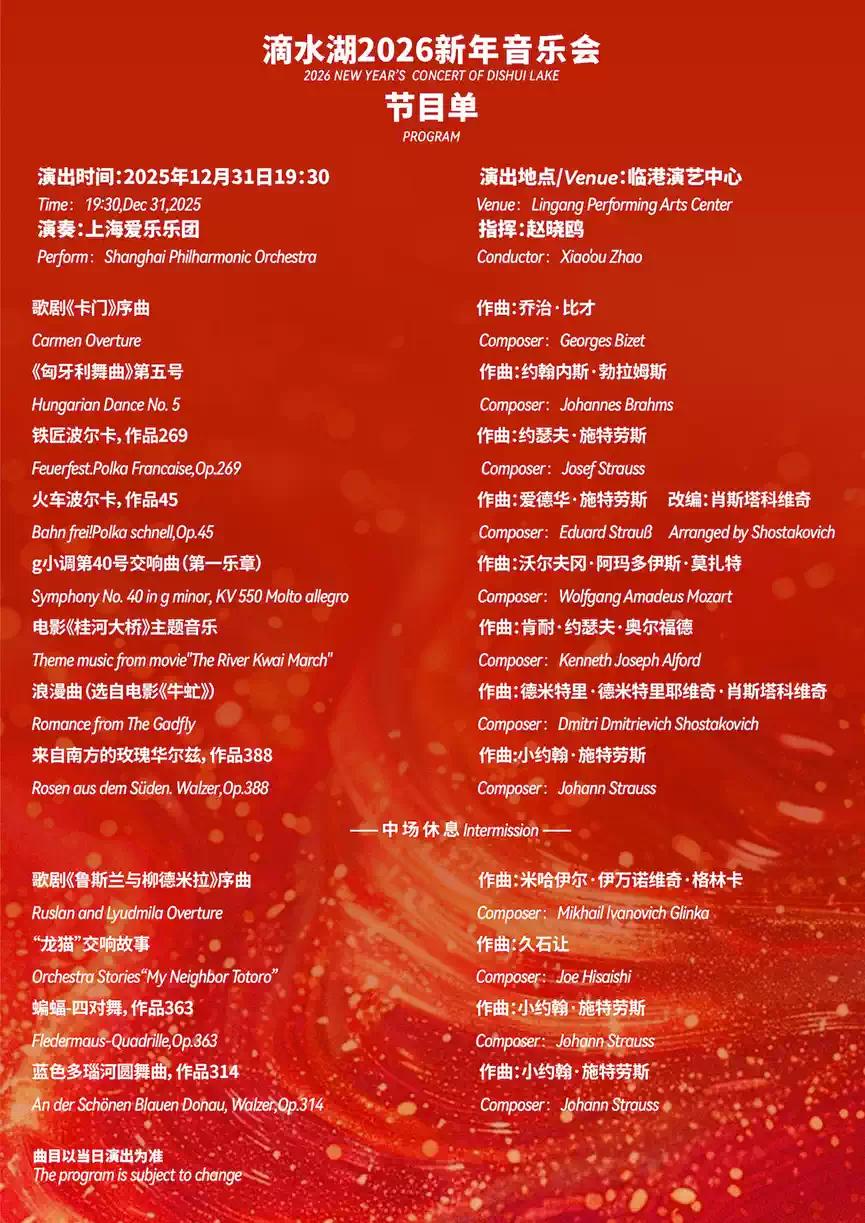 2025年12月31日19:30,「滴水湖2026新年音乐会」将于临港演艺中心重磅上演。著名指挥家赵晓鸥执棒上海爱乐乐团将为观众献上一场音乐盛宴。