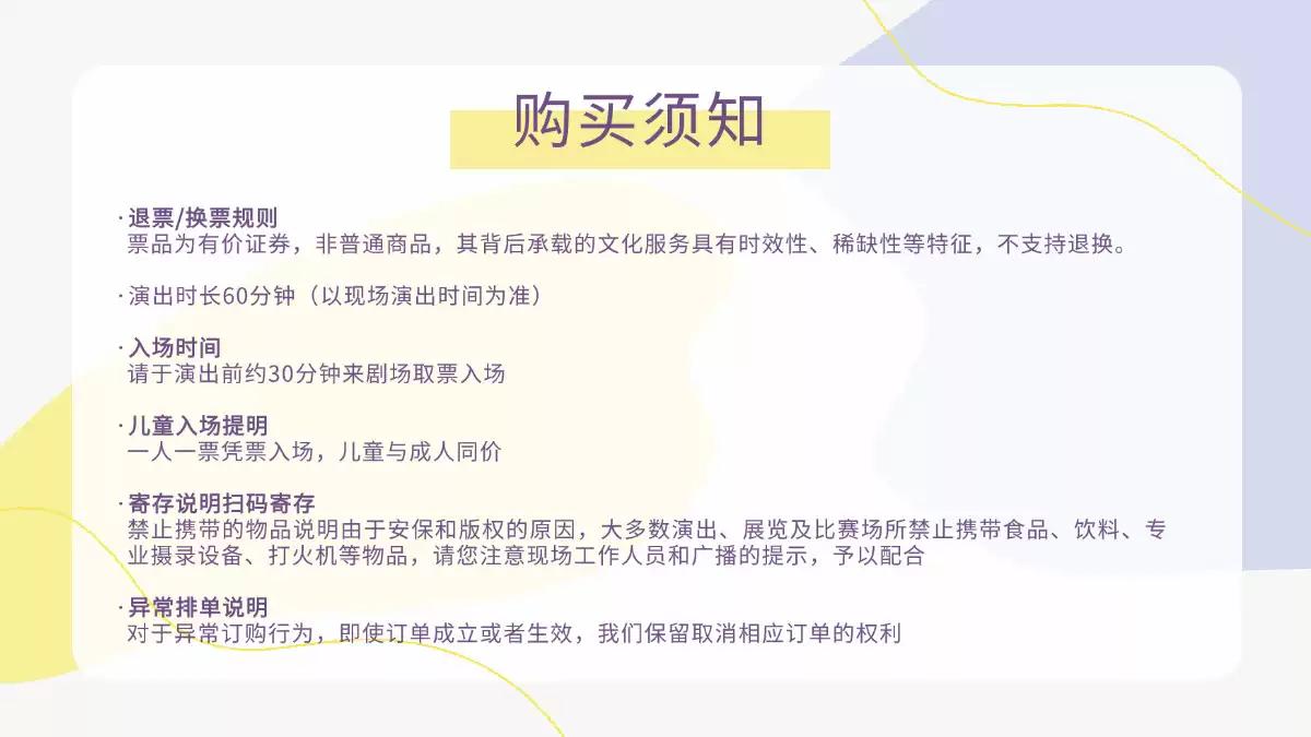 | 重要提示 | 演出现场气氛热烈,请您务必根据自身身体状况酌情是否购票参与观演,特别是患有心脏类疾病、急性心脑血管疾病、心肌炎、高血压等相关疾病的人群,请您务必遵照医嘱,结合病史及个人身体状况进行观演,观演期间请自行承担身体健康相关责任。 | 温馨提示 | 购买前请您提前规划好行程,做好相应准备,以免影响您的正常观演,感谢您的理解和配合。 若演出受不可抗力影响延期或取消,票牛将对演出票订单按照项目官方通知方案进行处理,其他因观演发生的费用需由您自行承担。 |
