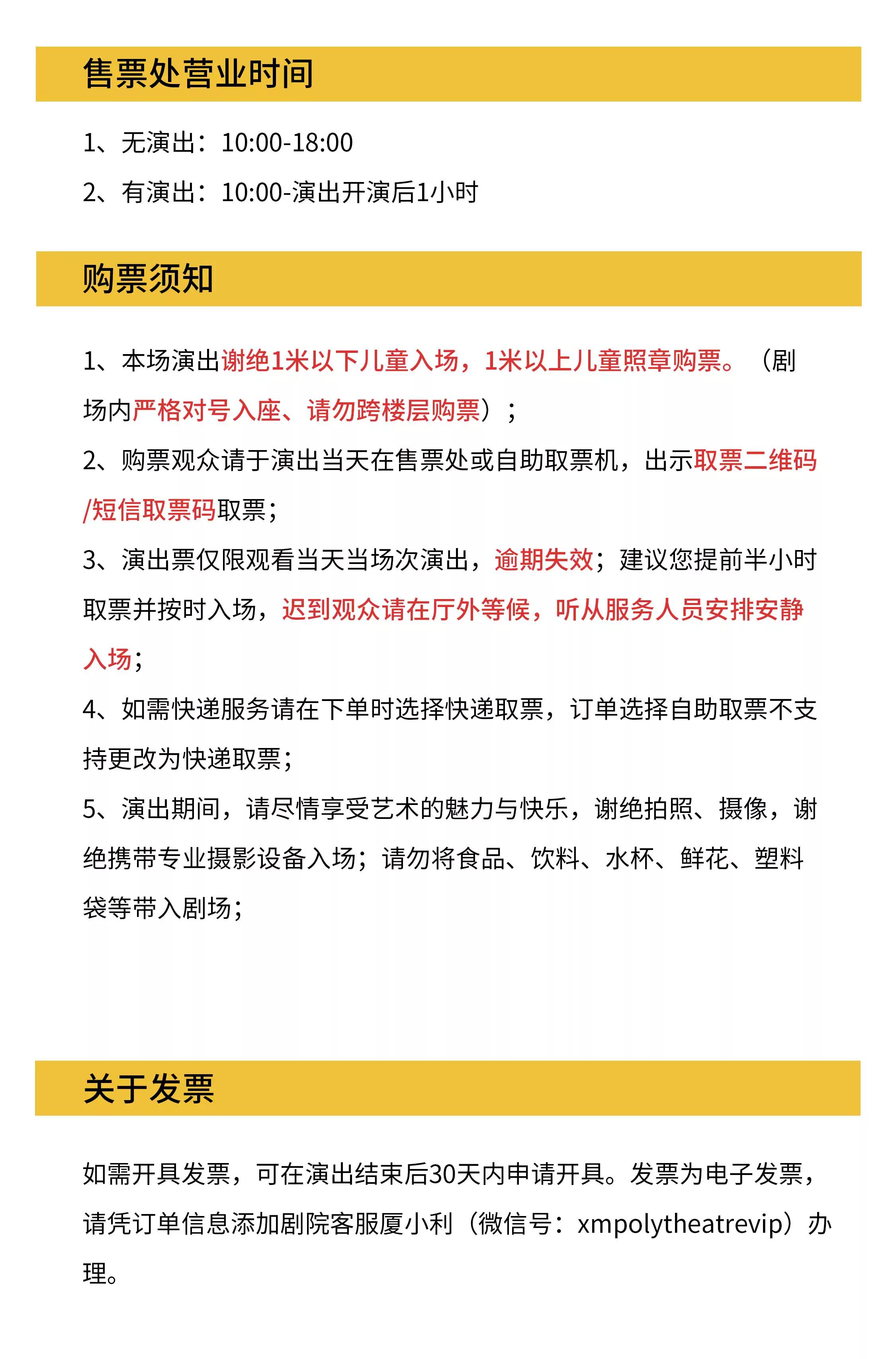 | 禁止携带物品 | 食品、饮料、相机、充电宝、打火机等 | 发票说明 | 如需开具发票,请在演出结束后一个月内联系客服并提供开票信息:票款发票由商家开具,平台服务费发票由票牛开具。 |