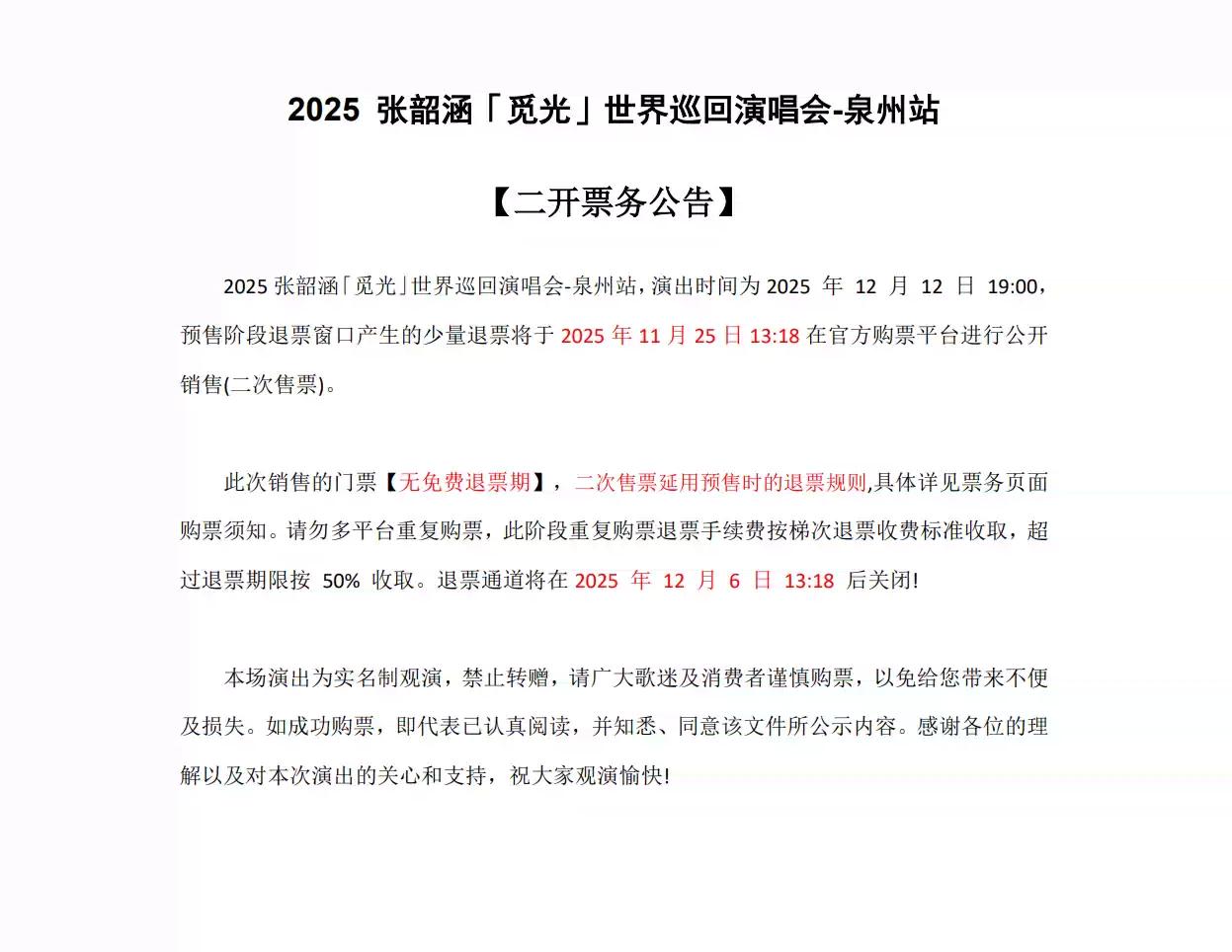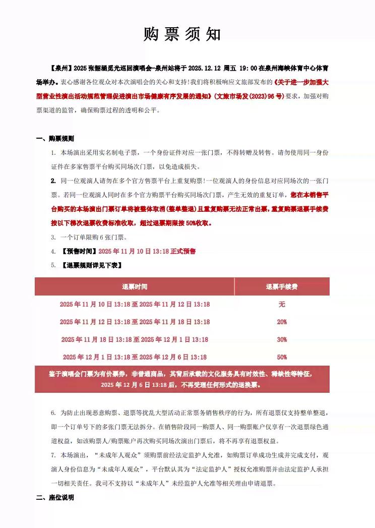 | 限购说明 | 每单限购6张 | 重复购票说明 | 同一位“实名观演人”请勿在多个售票平台重复购票,一位“实名观演人”的身份信息对应同场次的一张门票。 若同一位“实名观演人”被发现存在多个购票平台购买同场次行为,由该行为产生的无效重复订单、退票手续费、过期不可退票、无法入场等所有损失,均由购票人自行承担。 |