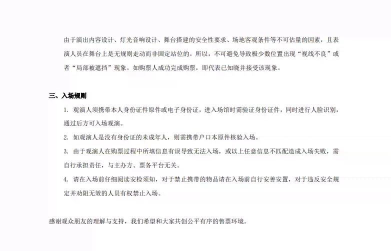 | 重要提示 | 演出现场气氛热烈,请您务必根据自身身体状况酌情是否购票参与观演,特别是患有心脏类疾病、急性心脑血管疾病、心肌炎、高血压等相关疾病的人群,请您务必遵照医嘱,结合病史及个人身体状况进行观演,观演期间请自行承担身体健康相关责任。 | 温馨提示 | 购买前请您提前规划好行程,做好相应准备,以免影响您的正常观演,感谢您的理解和配合。 若演出受不可抗力影响延期或取消,票牛将对演出票订单按照项目官方通知方案进行处理,其他因观演发生的费用需由您自行承担。 |
