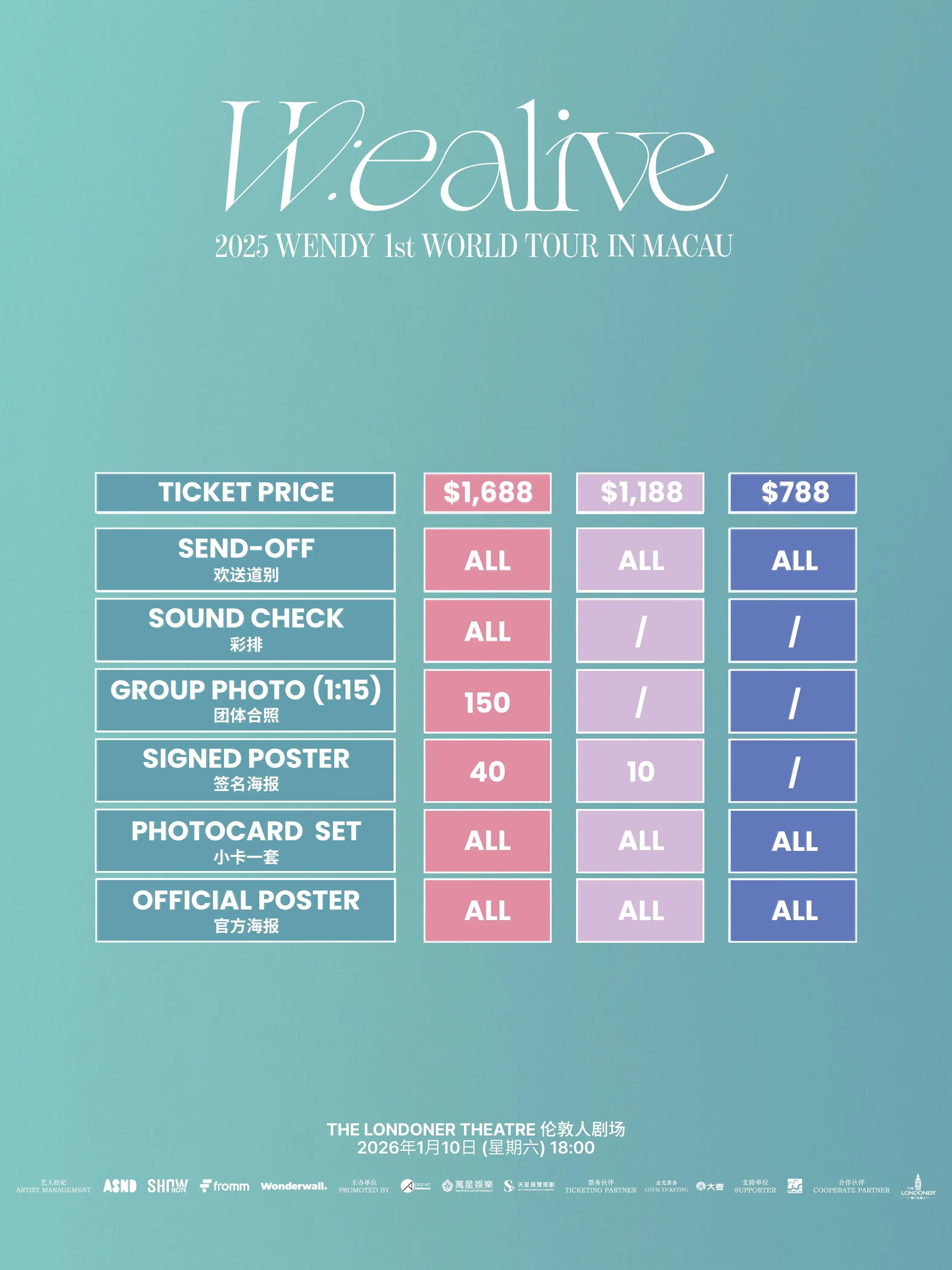 WENDY首次个人世界巡回《W:EALIVE》登陆澳门!以温暖歌声与惊艳舞台,呈现多彩音乐世界。这是一场充满生命力的音乐盛宴,与WENDY共同创造难忘回忆!