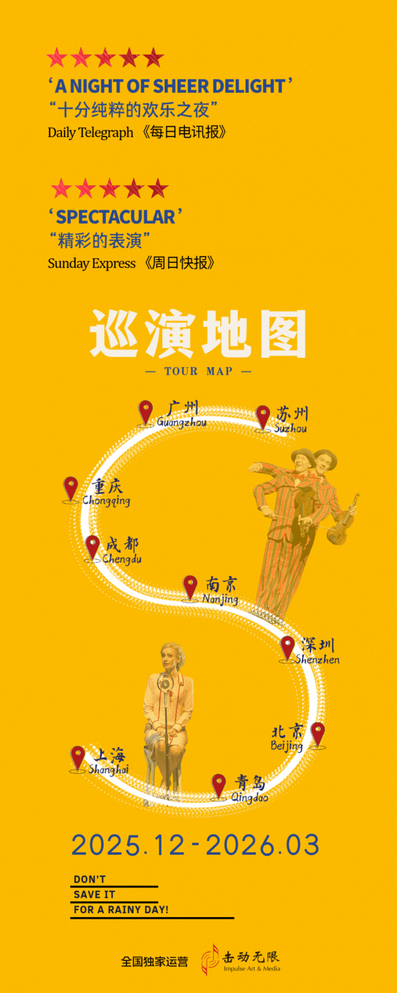 温馨提示:乐池前两排中间区域可能会感受到雨淋效果,请您根据自身需求选择座位。