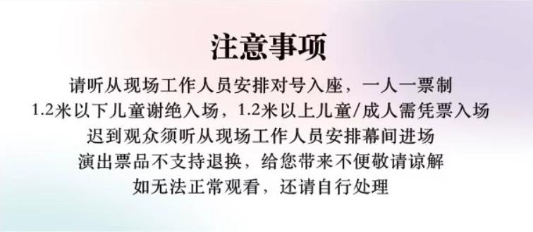 | 重要提示 | 演出现场气氛热烈,请您务必根据自身身体状况酌情是否购票参与观演,特别是患有心脏类疾病、急性心脑血管疾病、心肌炎、高血压等相关疾病的人群,请您务必遵照医嘱,结合病史及个人身体状况进行观演,观演期间请自行承担身体健康相关责任。 | 温馨提示 | 购买前请您提前规划好行程,做好相应准备,以免影响您的正常观演,感谢您的理解和配合。 若演出受不可抗力影响延期或取消,票牛将对演出票订单按照项目官方通知方案进行处理,其他因观演发生的费用需由您自行承担。 |