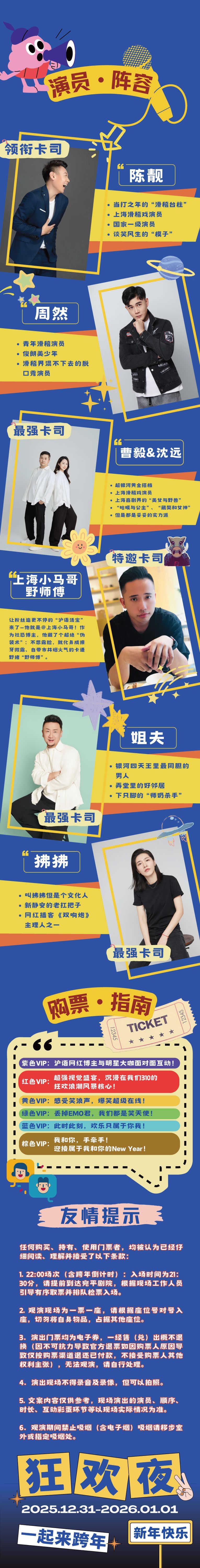 | 重要提示 | 演出现场气氛热烈,请您务必根据自身身体状况酌情是否购票参与观演,特别是患有心脏类疾病、急性心脑血管疾病、心肌炎、高血压等相关疾病的人群,请您务必遵照医嘱,结合病史及个人身体状况进行观演,观演期间请自行承担身体健康相关责任。 | 温馨提示 | 购买前请您提前规划好行程,做好相应准备,以免影响您的正常观演,感谢您的理解和配合。 若演出受不可抗力影响延期或取消,票牛将对演出票订单按照项目官方通知方案进行处理,其他因观演发生的费用需由您自行承担。 |