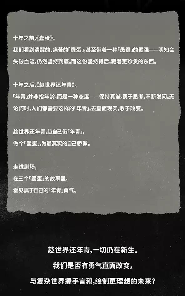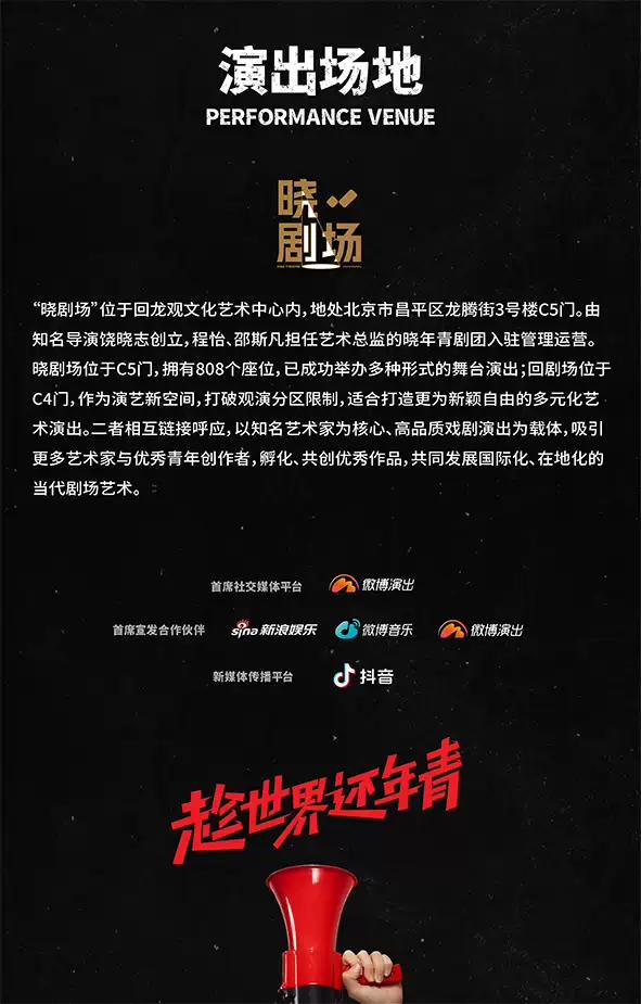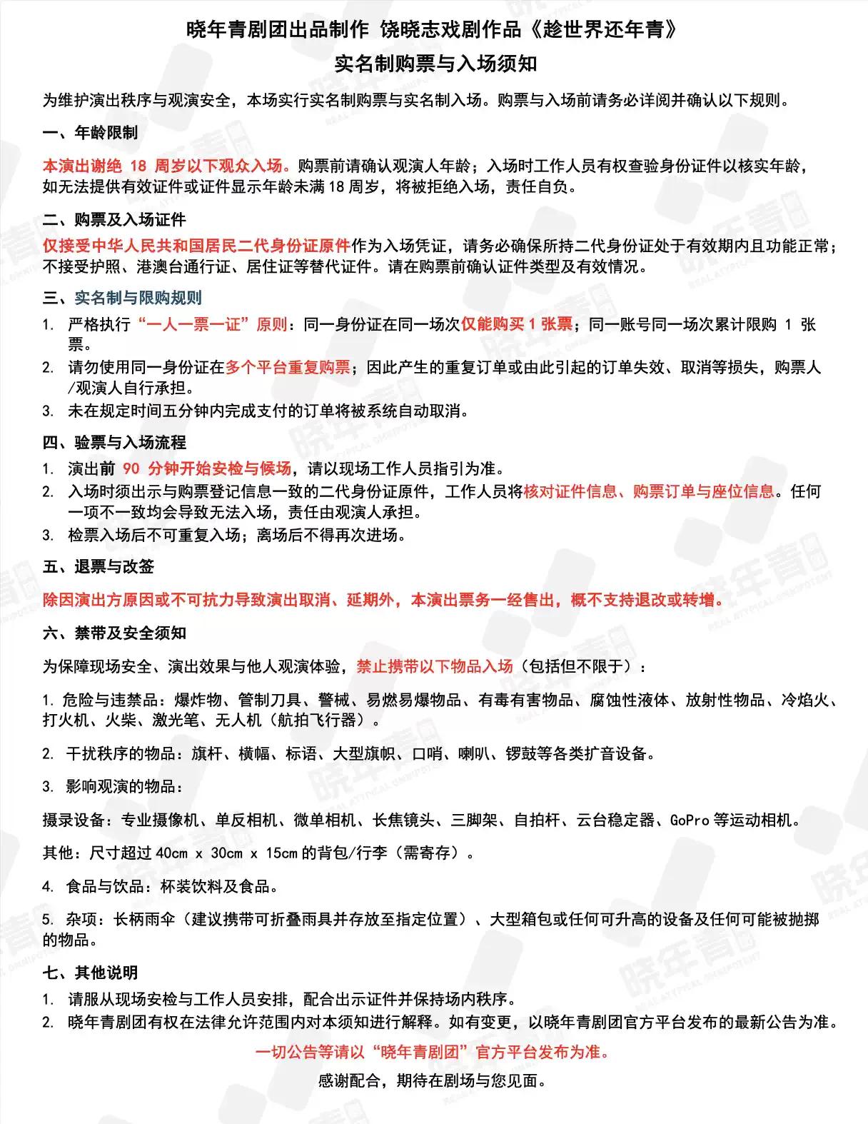 | 儿童入场提示 | 本演出谢绝18周岁以下观众入场 | 禁止携带物品 | 食品、饮料、相机、充电宝、打火机等 |