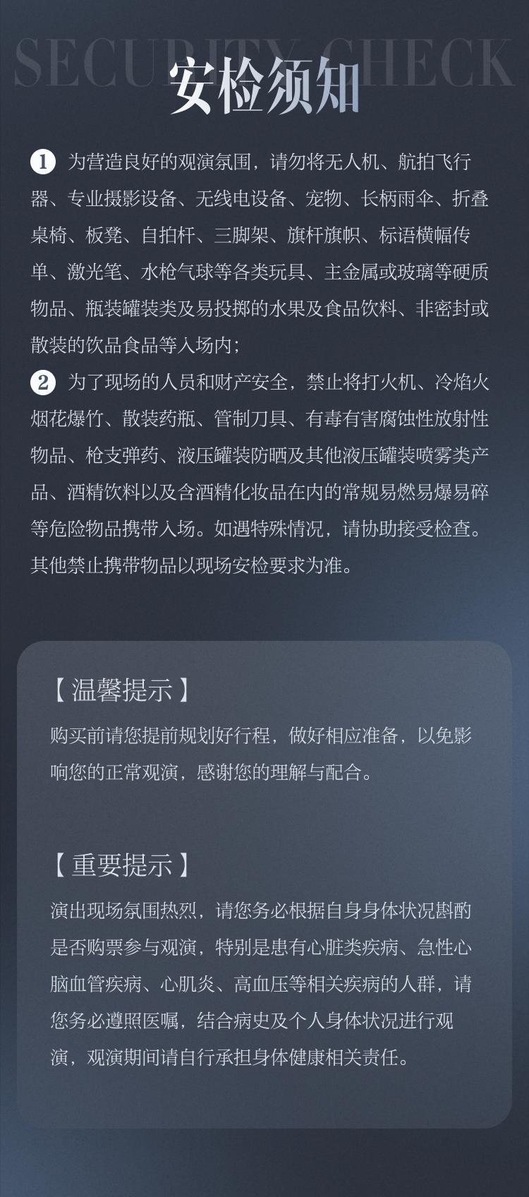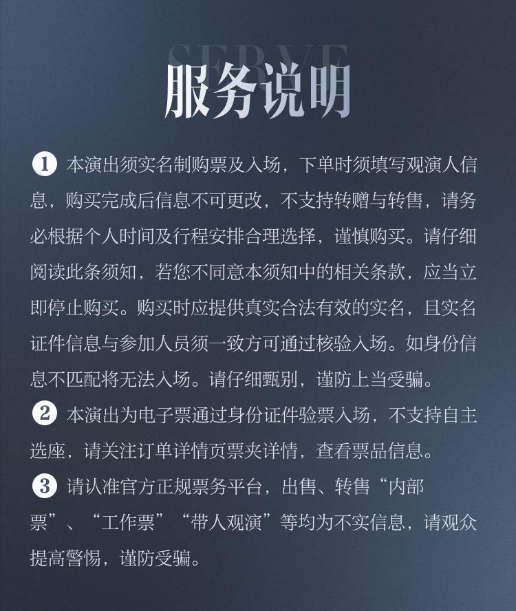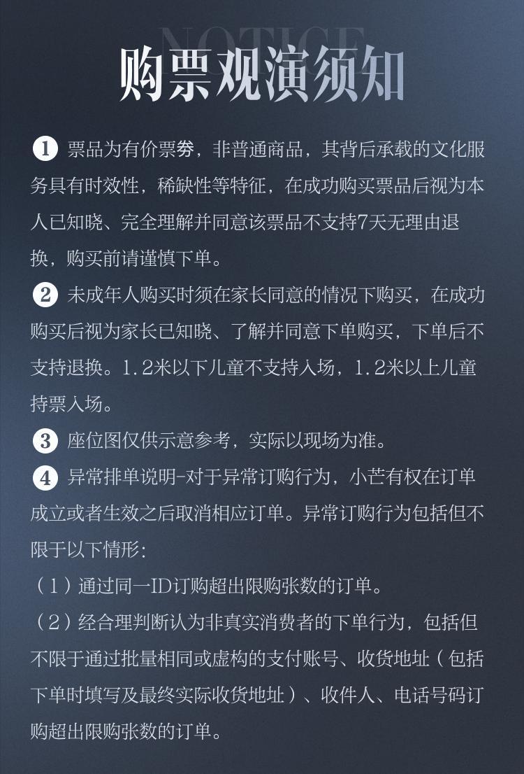 | 限购说明 | 每单限购2张 | 重复购票说明 | 同一位“实名观演人”请勿在多个售票平台重复购票,一位“实名观演人”的身份信息对应同场次的一张门票。 若同一位“实名观演人”被发现存在多个购票平台购买同场次行为,由该行为产生的无效重复订单、退票手续费、过期不可退票、无法入场等所有损失,均由购票人自行承担。 |