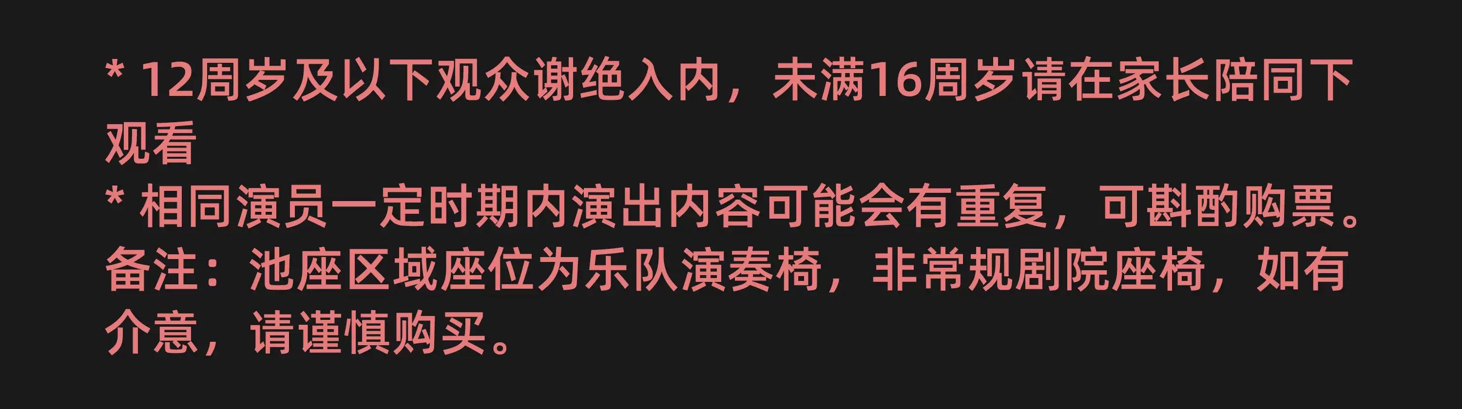 | 座位类型 | 请按门票对应座位,有序对号入座 | 儿童入场提示 | 童购票 12周岁及以下观众谢绝入内,未满16周岁请在家长陪同下观看。 |