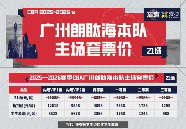 本套票包含2025-2026赛季广州朗肽海本队主场2025年12月23日-2026年4月24日共计21场比赛。须注意16场在奥冠体育华南农业大学综合体育馆进行,其余5场在广州体育馆进行。我们将为您在广州体育馆安排与华南奥冠体育华南农业大学综合体育馆中同票档优质位置,请合理安排出行计划!鉴于本赛季球队实行双主场,优质座位有限,我们将优先为套票用户进行安排,以确保套票球迷享有更为理想的观演体验。