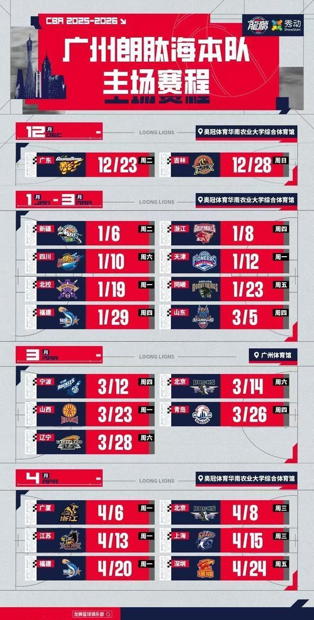 2017-2018赛季,广州龙狮队首次挺进季后赛。自2020-2021赛季起,球队战绩稳步提升并连续4个赛季挺进季后赛。其中,在2023-2024赛季,广州龙狮队在季后赛首轮淘汰青岛队挺进联赛八强追平队史最佳成绩。赛季后,原主教练郭士强指导升任中国男篮主教练,球队新星崔永熙在俱乐部的支持下前往NBA追逐篮球梦想。在今年休赛期,广州龙狮队受邀参加了NBA季前赛,分别与圣安东尼奥马刺、洛杉矶快船、明尼苏达森林狼三支NBA球队进行比赛交流,此行考察年轻球员和阵容磨合的同时,也增加了广州龙狮的国际曝光度,进一步体现了广州龙狮年轻化、国际化,商业化的品牌理念。2025年12月23日起,CBA联赛2025-26赛季广州朗肽海本第一阶段的主场比赛(广州赛区)将在华南农业大学这片学术热土中开始新赛季的征程!值得期待的不仅有CBA超级明星后卫郭艾伦,CBA2023届选秀状元陈国豪,本届亚洲杯随中国男篮出征的李祥波、在NBA季前赛表现亮眼的刘颜诚,更有张文杰、徐昕等一批年轻有为、值得期待的新星!