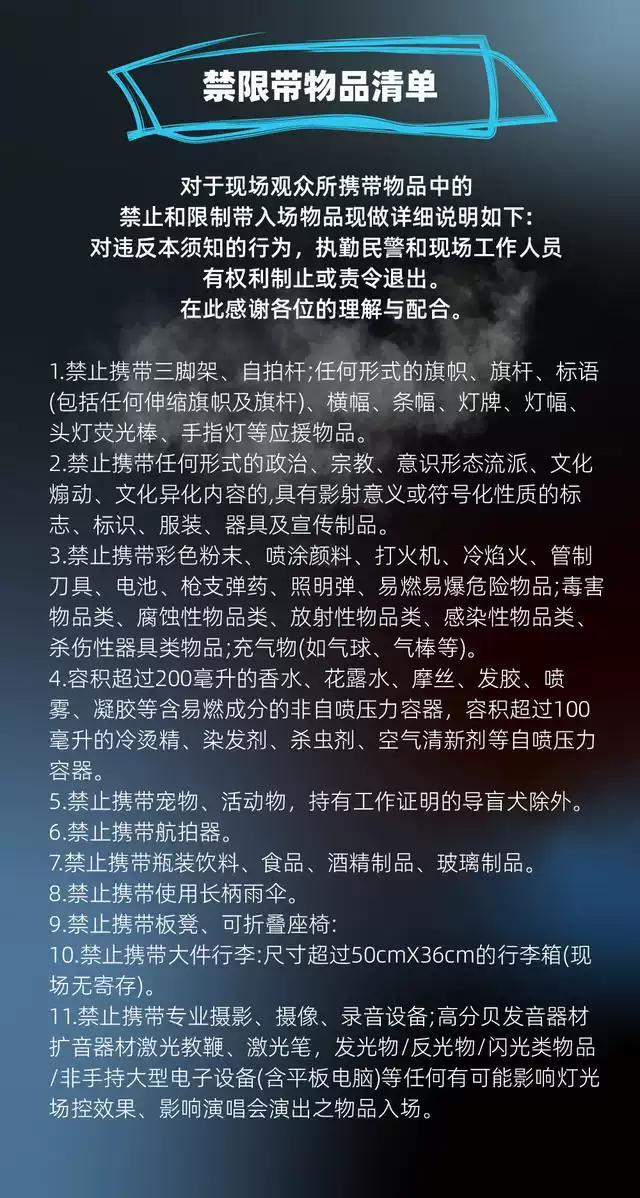 | 禁止携带物品 | 食品、饮料、相机、充电宝、打火机等 | 发票说明 | 如需开具发票,请在演出结束后一个月内联系客服并提供开票信息:票款发票由商家开具,平台服务费发票由票牛开具。 |