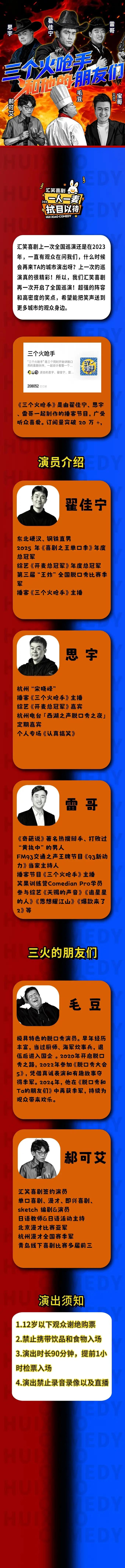 | 限购说明 | 每单限购6张 | 重复购票说明 | 同一位“实名观演人”请勿在多个售票平台重复购票,一位“实名观演人”的身份信息对应同场次的一张门票。 若同一位“实名观演人”被发现存在多个购票平台购买同场次行为,由该行为产生的无效重复订单、退票手续费、过期不可退票、无法入场等所有损失,均由购票人自行承担。 |