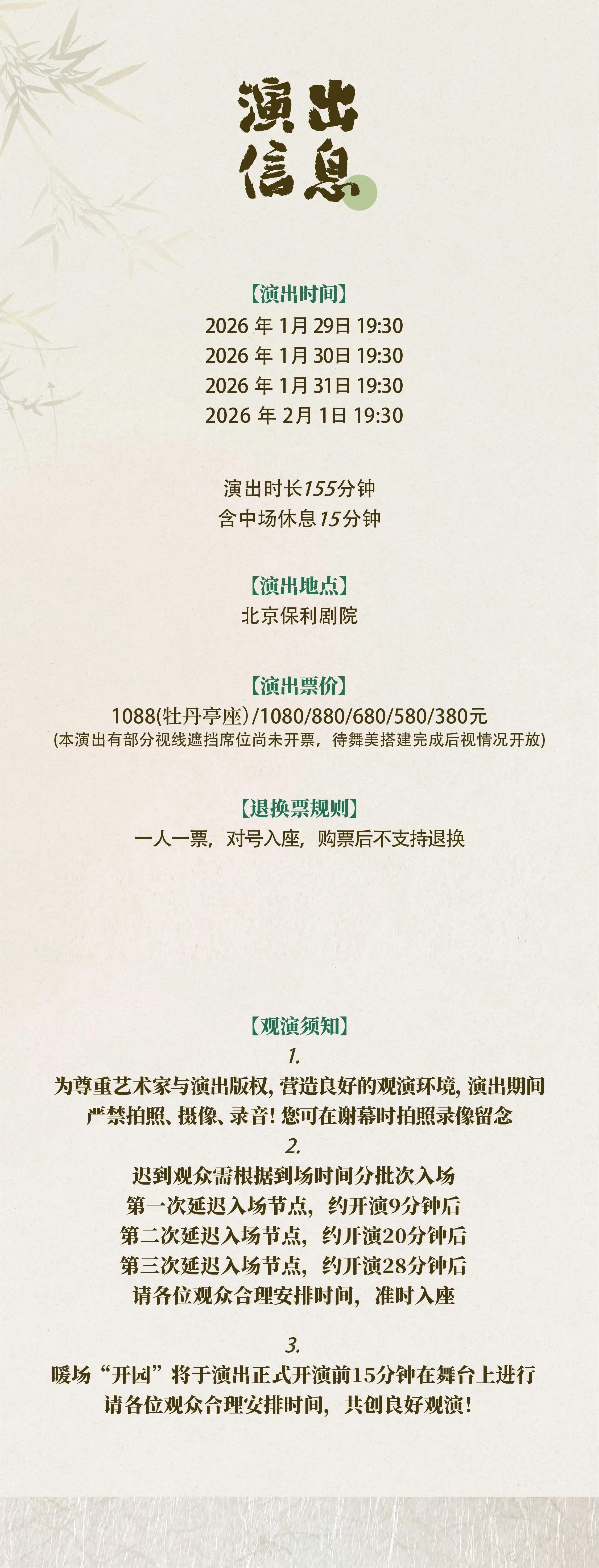 演出票价:1088(牡丹亭座)/1080/880/680/580/380元
