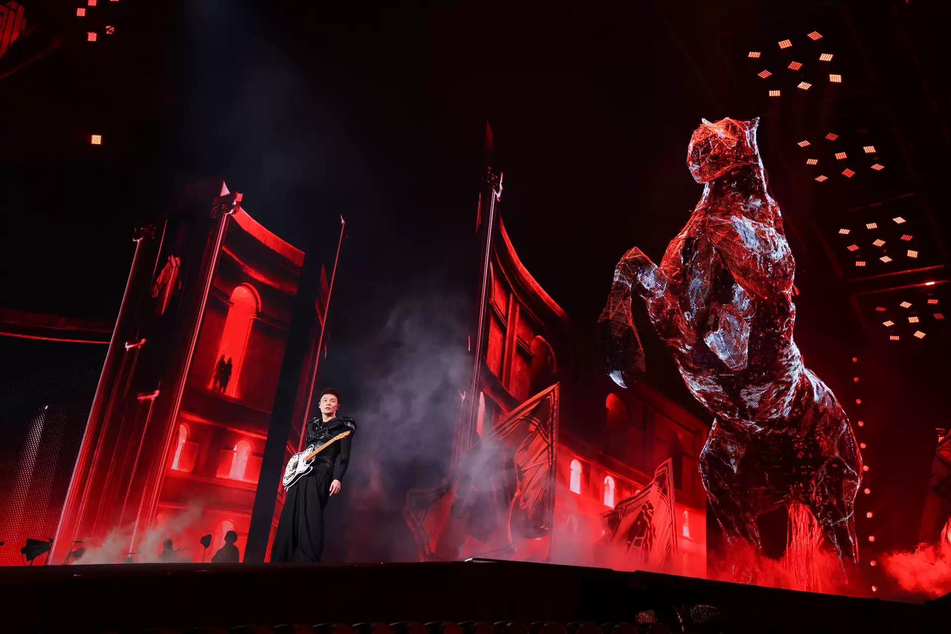 一座巨型黑马艺术装置,以策马奔腾之势伫立在舞台的绝对中心。