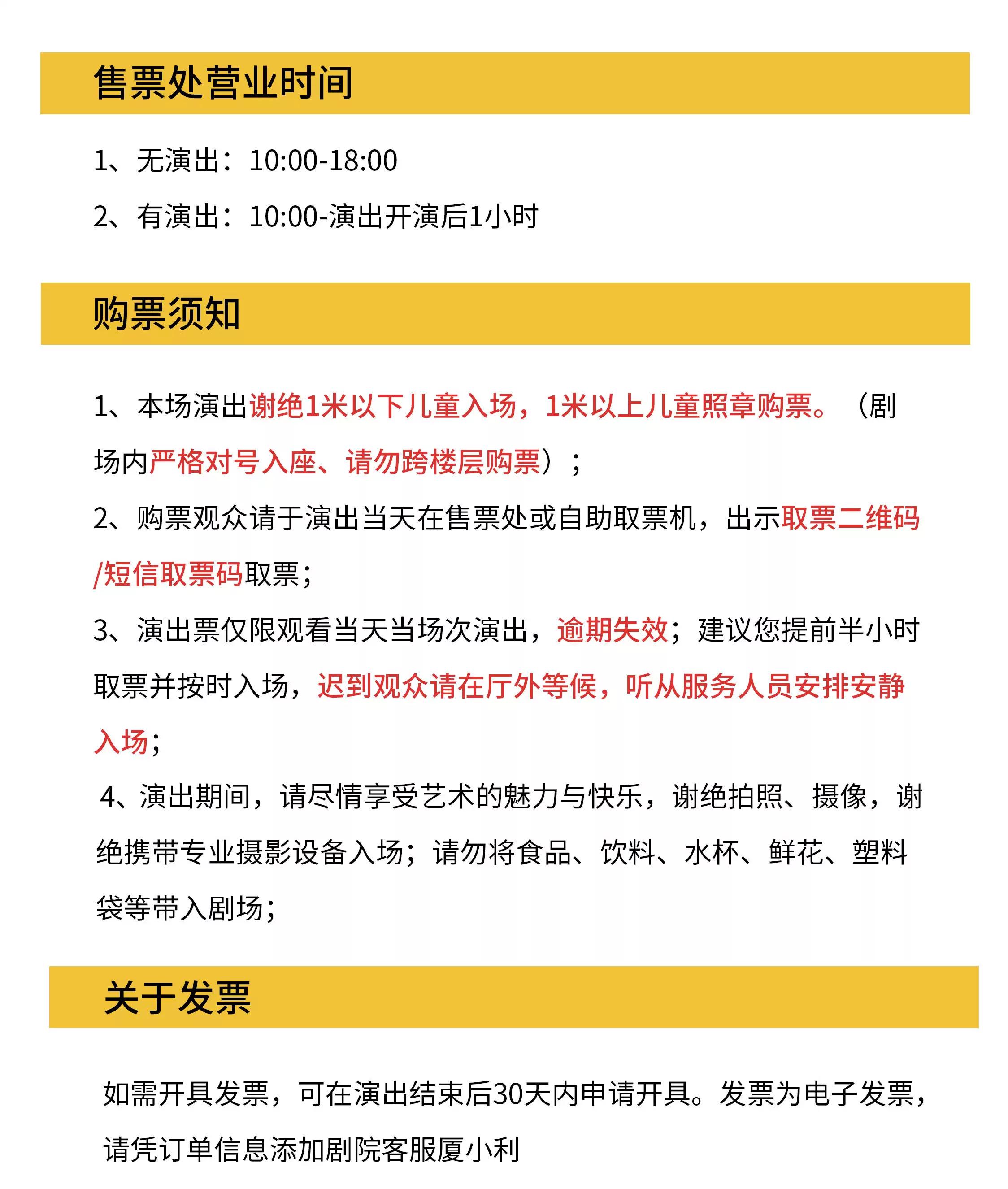| 座位类型 | 请按门票对应座位,有序对号入座 | 儿童入场提示 | 本场演出谢绝1米以下儿童入场,1米以上儿童照章购票。 |