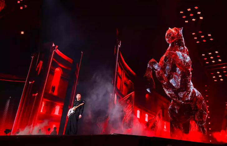 一座巨型黑马艺术装置,以策马奔腾之势伫立在舞台的绝对中心。