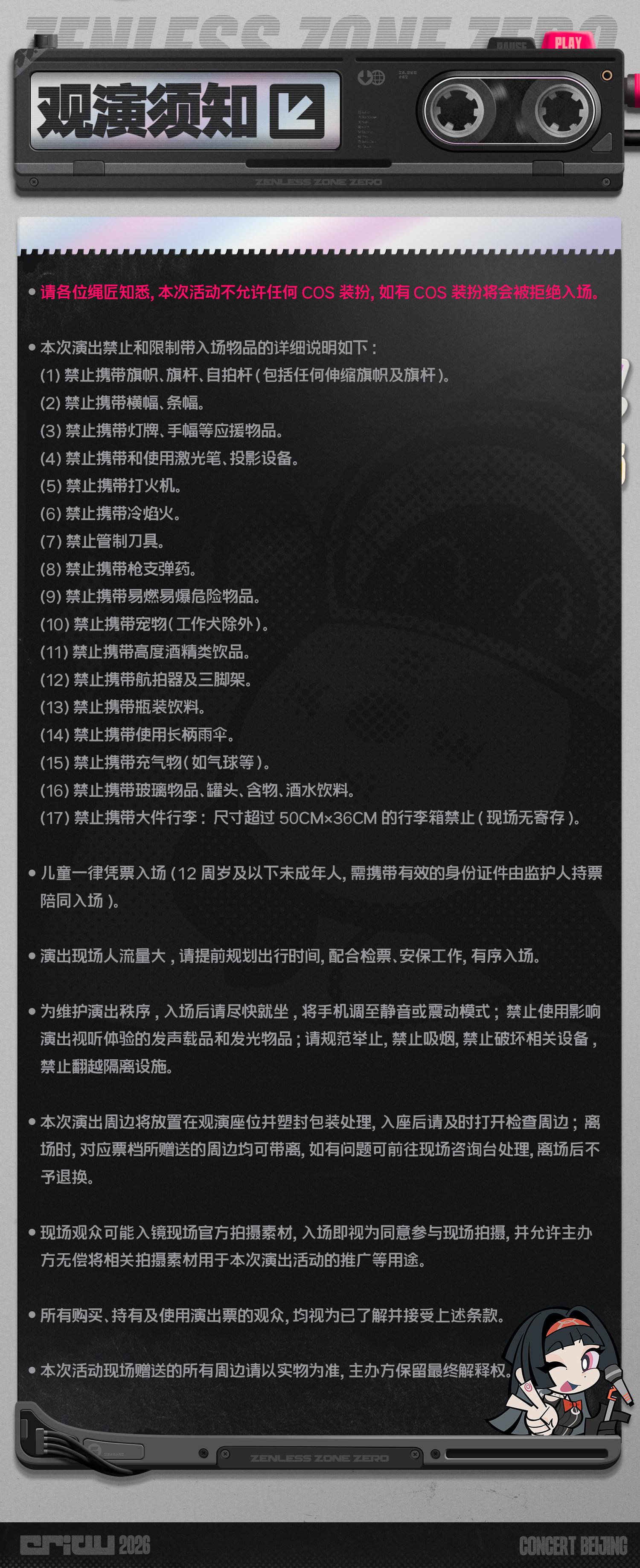 | 儿童入场提示 | 儿童一律凭成人票入场,12岁及以下儿童需要监护人陪同 | 禁止携带物品 | 食品、饮料、相机、充电宝、打火机等 |