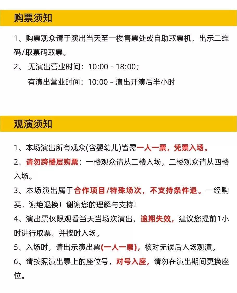 | 座位类型 | 请按门票对应座位,有序对号入座 | 儿童入场提示 | 本场演出所有观众(含婴幼儿)皆需一人一票,凭票入场 |