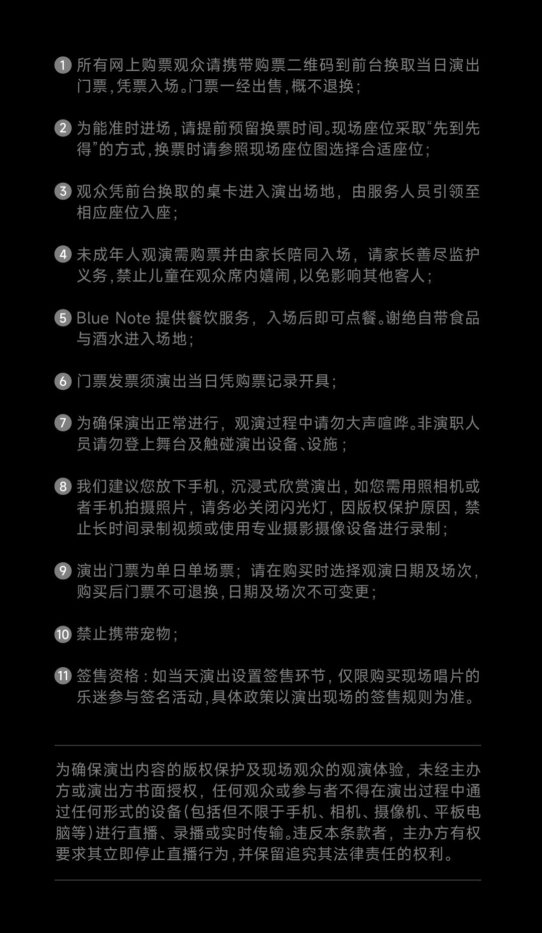 | 电子票 | 本项目支持凭电子票入场。 -请至少提前一天购买,开演前24小时内,票牛会发送取票短信,请按短信提示内容取票。 |