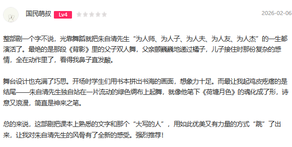 舞剧《朱自清》 以著名散文家、诗人、学者、民主斗士朱自清生平事迹、文学成就及其在华人世界的影响为基础,再现先生为人师、为人子、为人父、为人夫、为人友、为人杰这个“大写的人”。