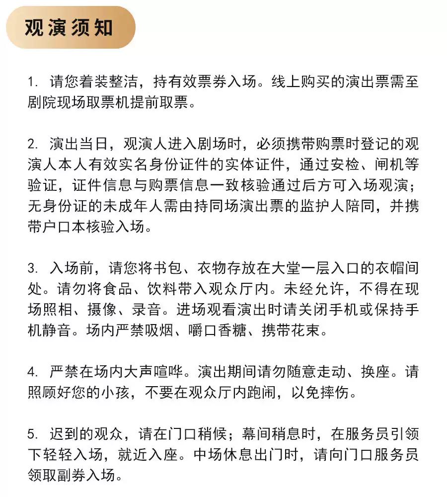 1.演出当日,观演人进入剧场时,必须携带购票时登记的观演人本人有效实名身份证件的实体证件,通过安检、闸机等验证,证件信息与购票信息一致核验通过后方可入场观演;