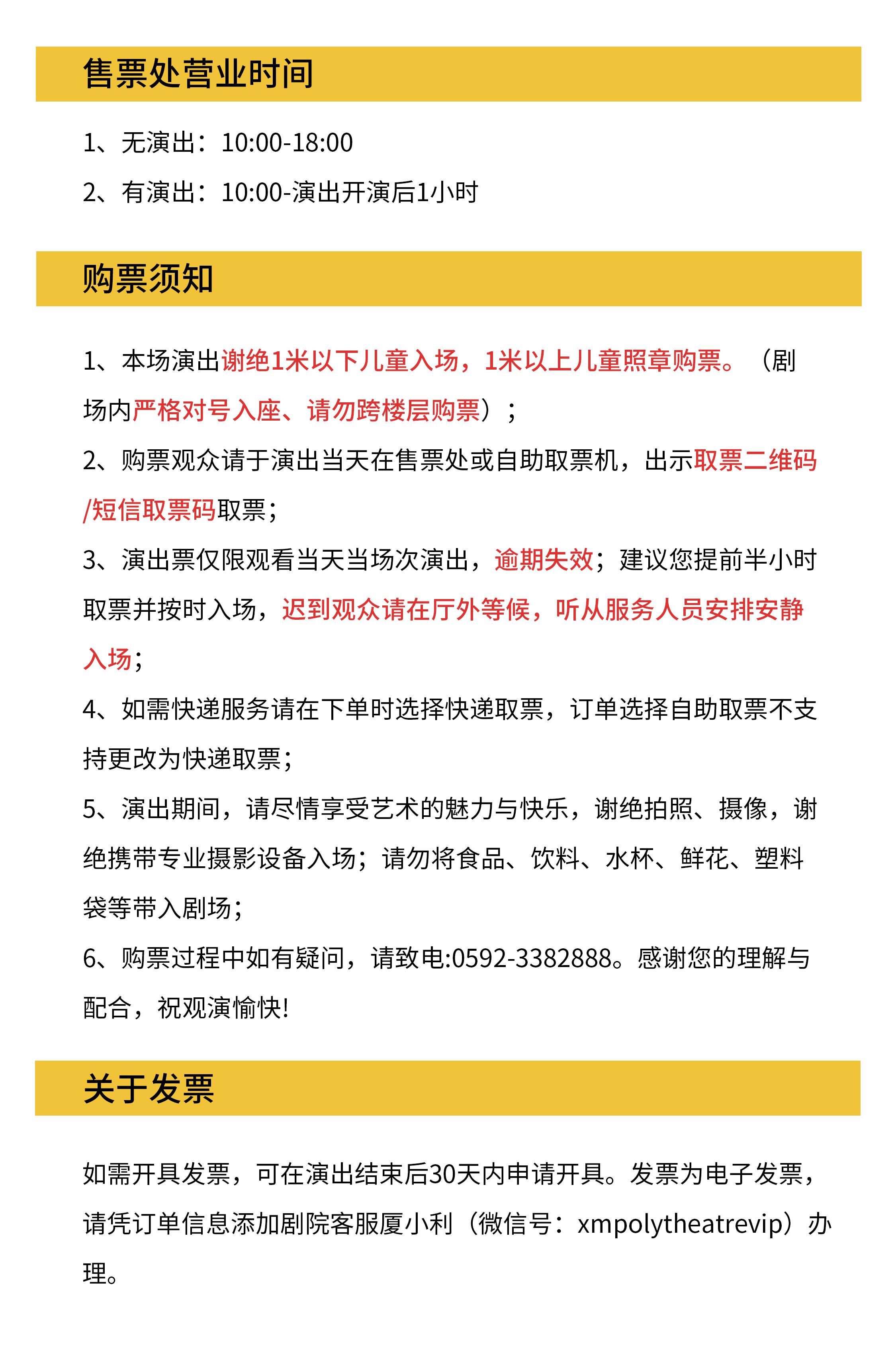 | 禁止携带物品 | 食品、饮料、相机、充电宝、打火机等 | 发票说明 | 如需开具发票,请在演出结束后一个月内联系客服并提供开票信息:票款发票由商家开具,平台服务费发票由票牛开具。 |