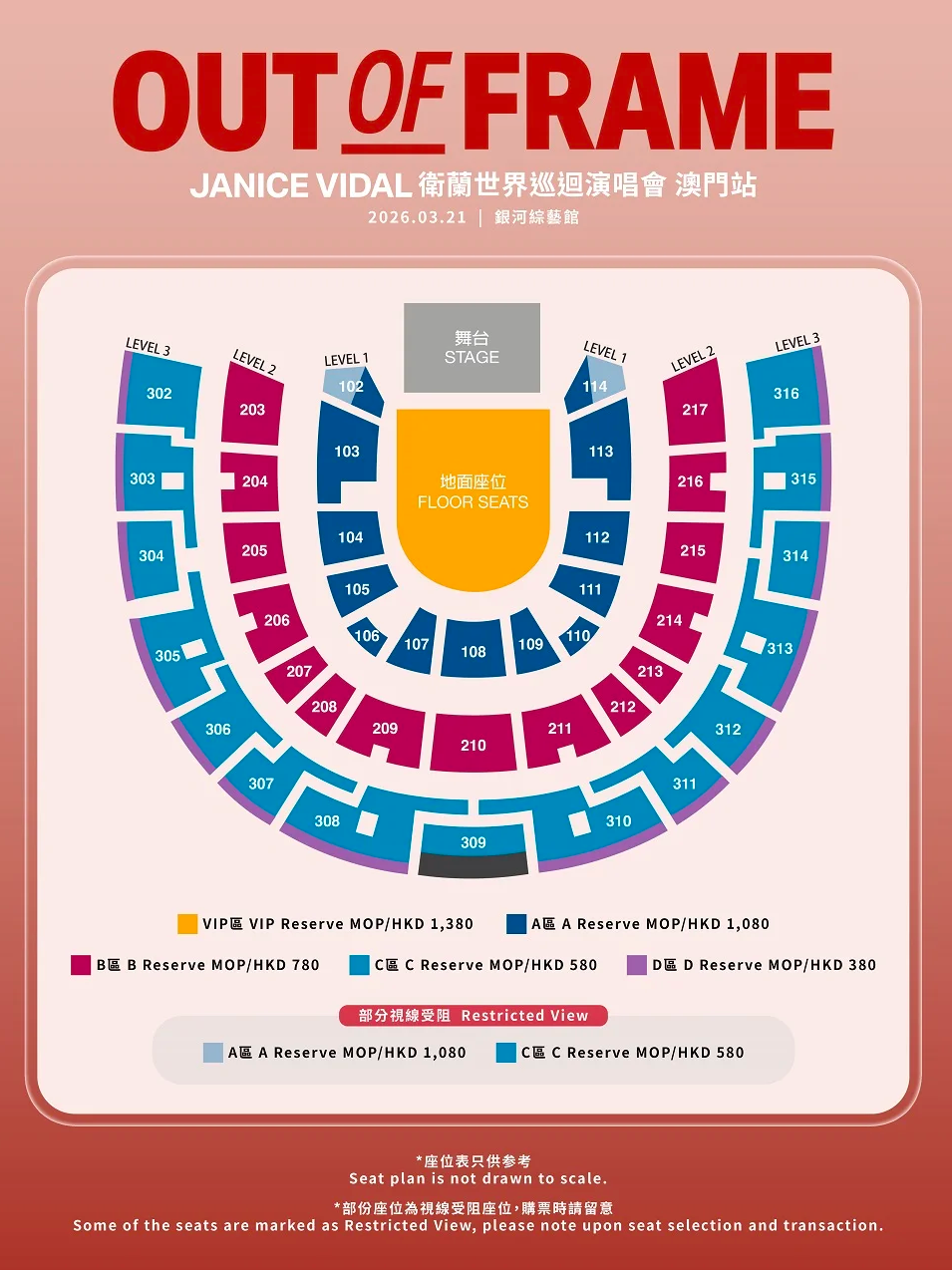 澳门币票价MOP:1380 / 1080 / 780 / 580 / 380