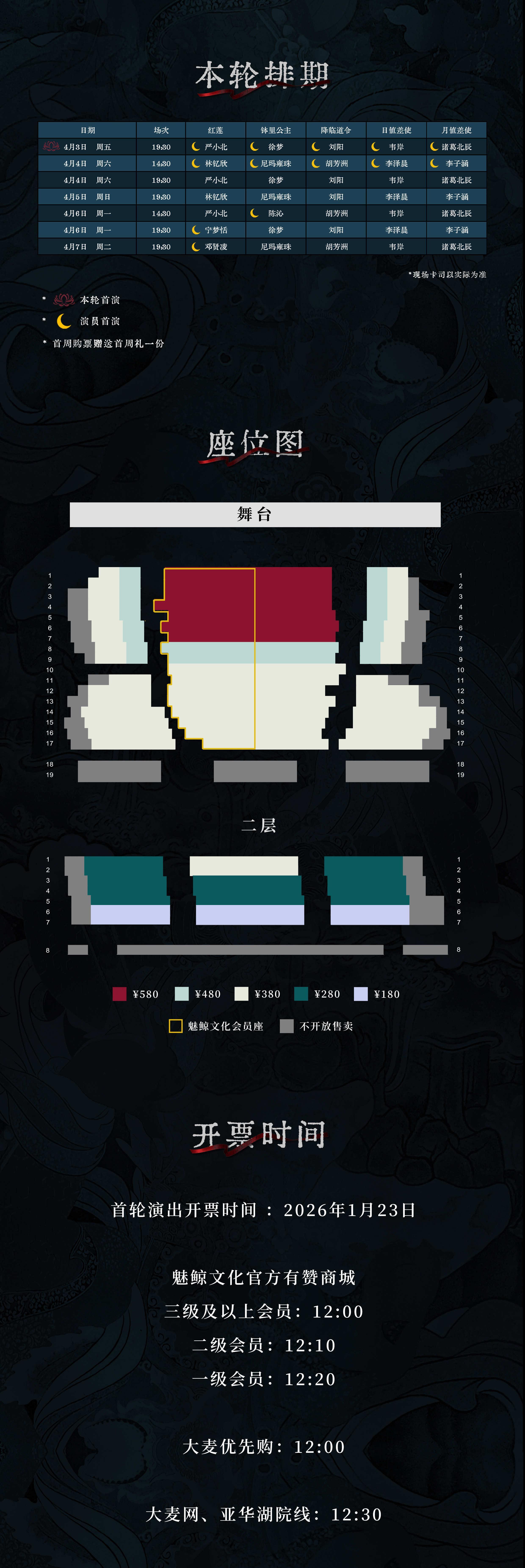 2.因剧情需要,开场前未入场的观众及迟到观众请于幕间工作人员安排下入场(约开场后10分钟),请勿扰乱现场秩序