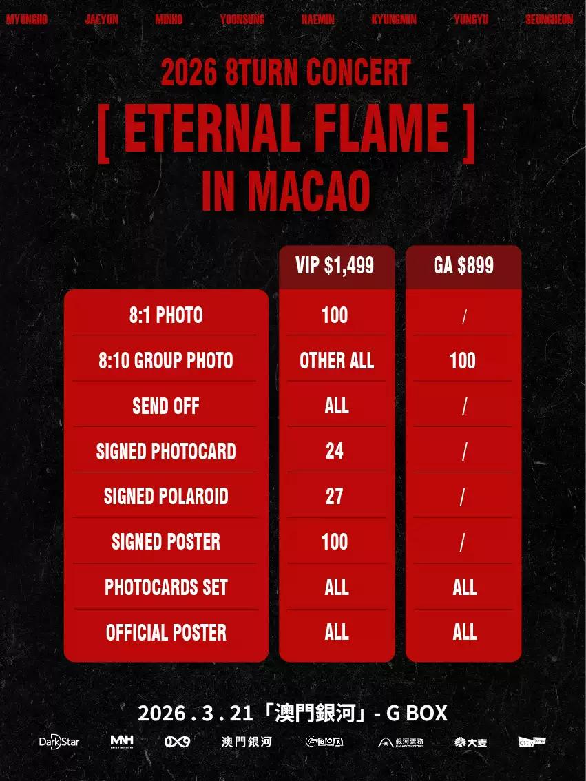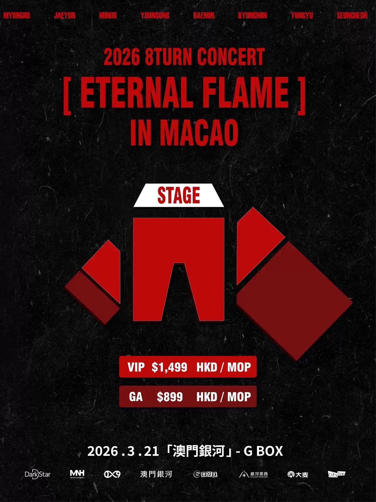 8TURN 首次携全新巡演[ETERNAL FLAME]登陆澳门,以炽热舞台点燃现场。强烈节奏与细腻情感交织,展现成员们持续进化的音乐实力与舞台魅力。本次演出将在光与火焰交汇的舞台上,为观众留下只属于这一刻的现场记忆。