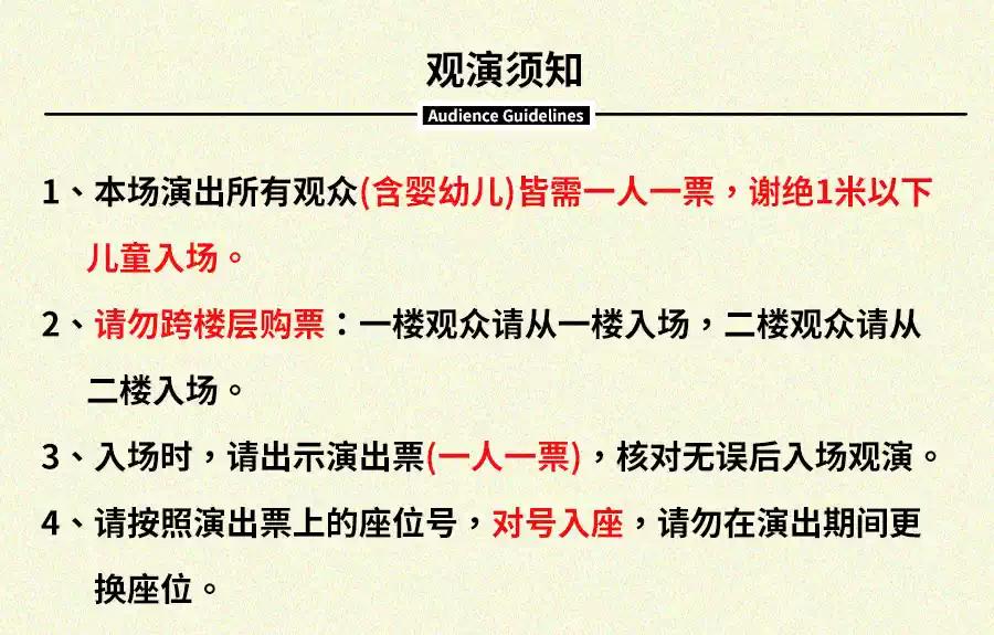 | 座位类型 | 请按门票对应座位,有序对号入座 | 儿童入场提示 | 一人一票,1米以下儿童谢绝入场 |