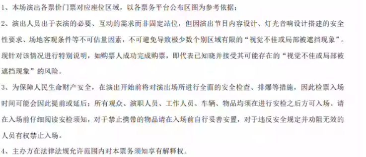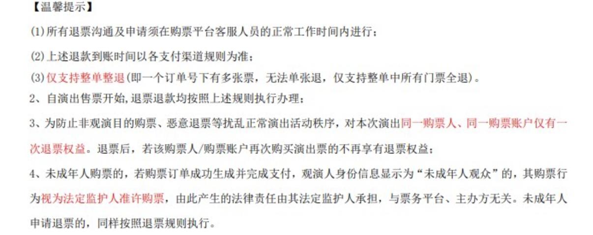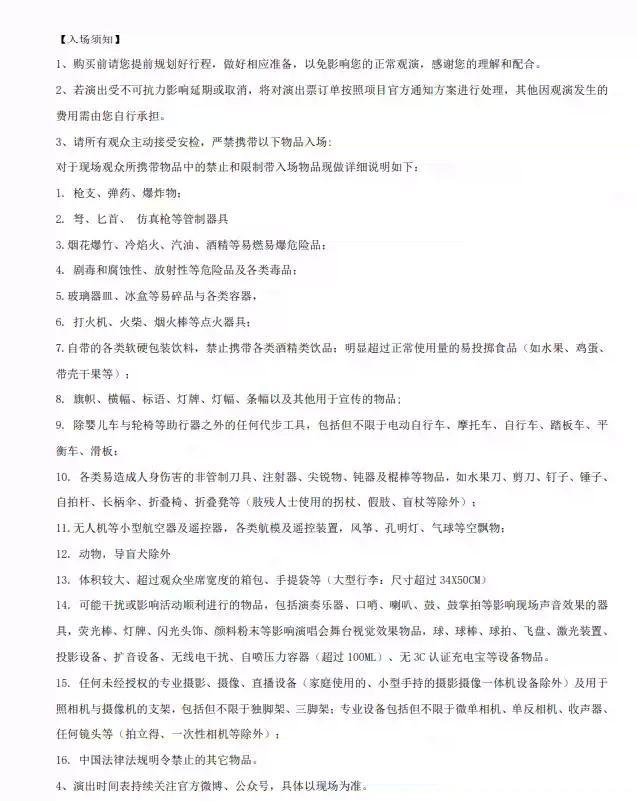 | 温馨提示 | 购买前请您提前规划好行程,做好相应准备,以免影响您的正常观演,感谢您的理解和配合。 若演出受不可抗力影响延期或取消,票牛将对演出票订单按照项目官方通知方案进行处理,其他因观演发生的费用需由您自行承担。 | 电子票 | 本项目支持凭电子票入场。 -请至少提前一天购买,开演前24小时内,票牛会发送取票短信,请按短信提示内容取票。 |