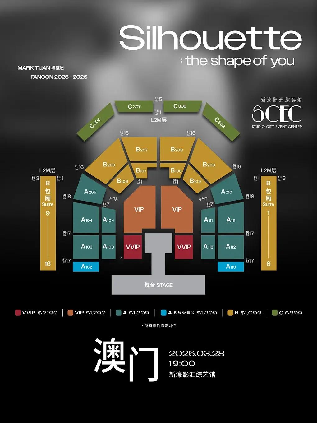 澳门币票价MOP:2199 / 1799 / 1399 / 1099 / 899