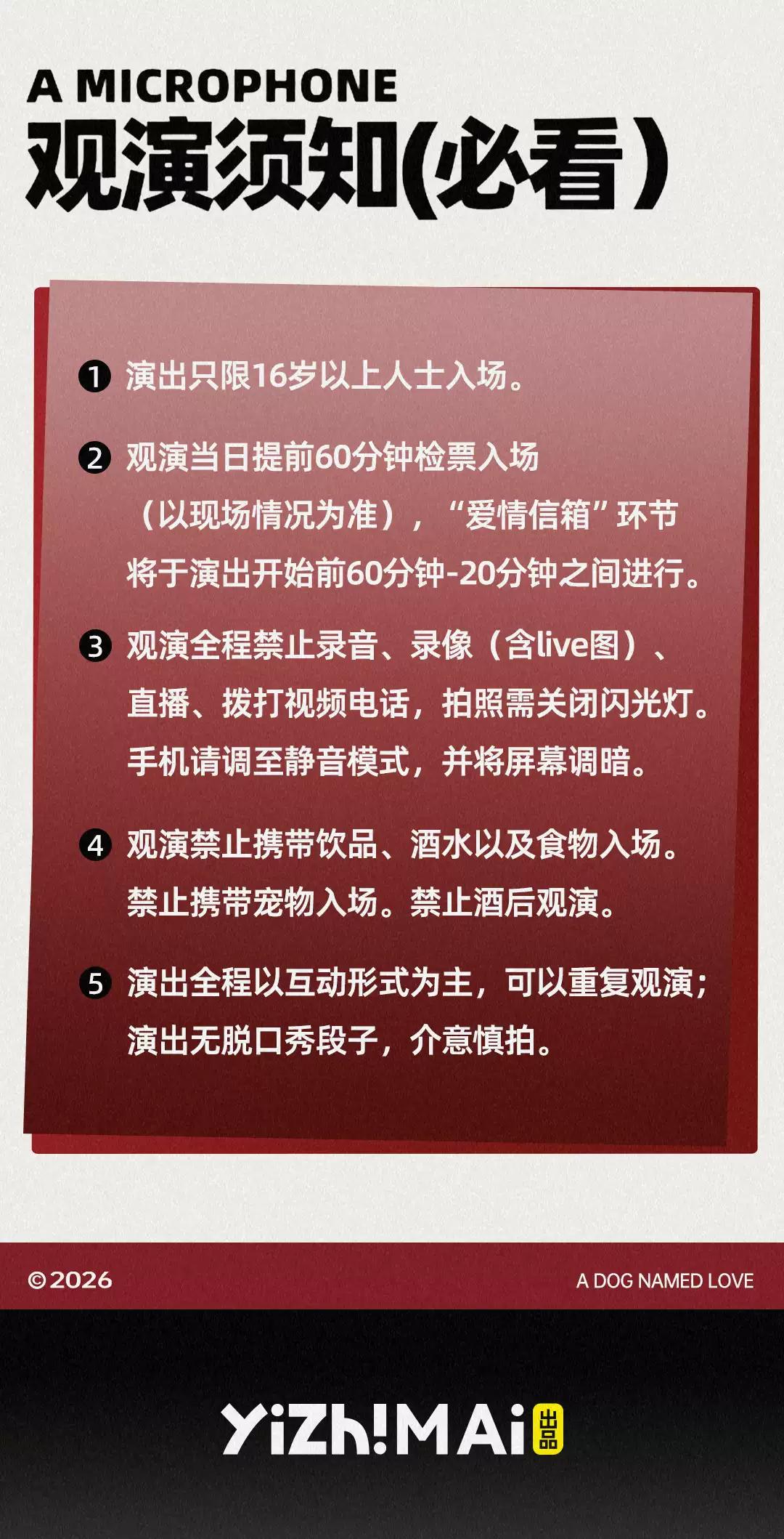 | 禁止携带物品 | 食品、饮料、相机、充电宝、打火机等 | 发票说明 | 如需开具发票,请在演出结束后一个月内联系客服并提供开票信息:票款发票由商家开具,平台服务费发票由票牛开具。 |