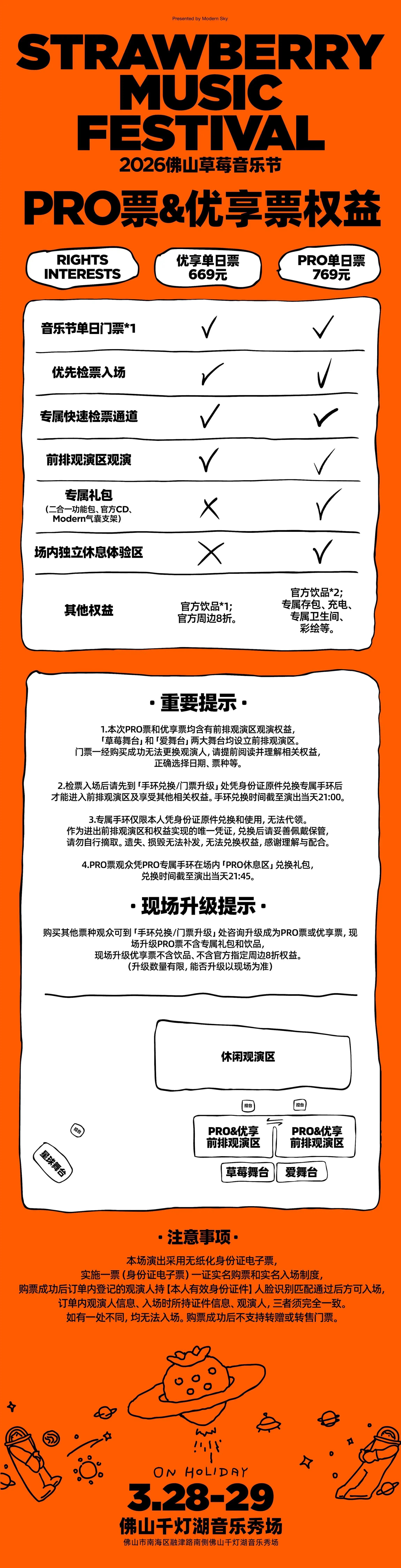 PRO单日票769元:含音乐节单日票门票1张,以及专属礼包、专属权益。(专属礼包:二合一功能包 ×1、随机官方CD ×1、Modern气囊支架×1;专属权益:草莓舞台和爱舞台前排观演;独立休息区;专属快速检票通道;优先检票入场;官方指定饮品×2;专属存包处;独立卫生间;充电处;彩绘区。)