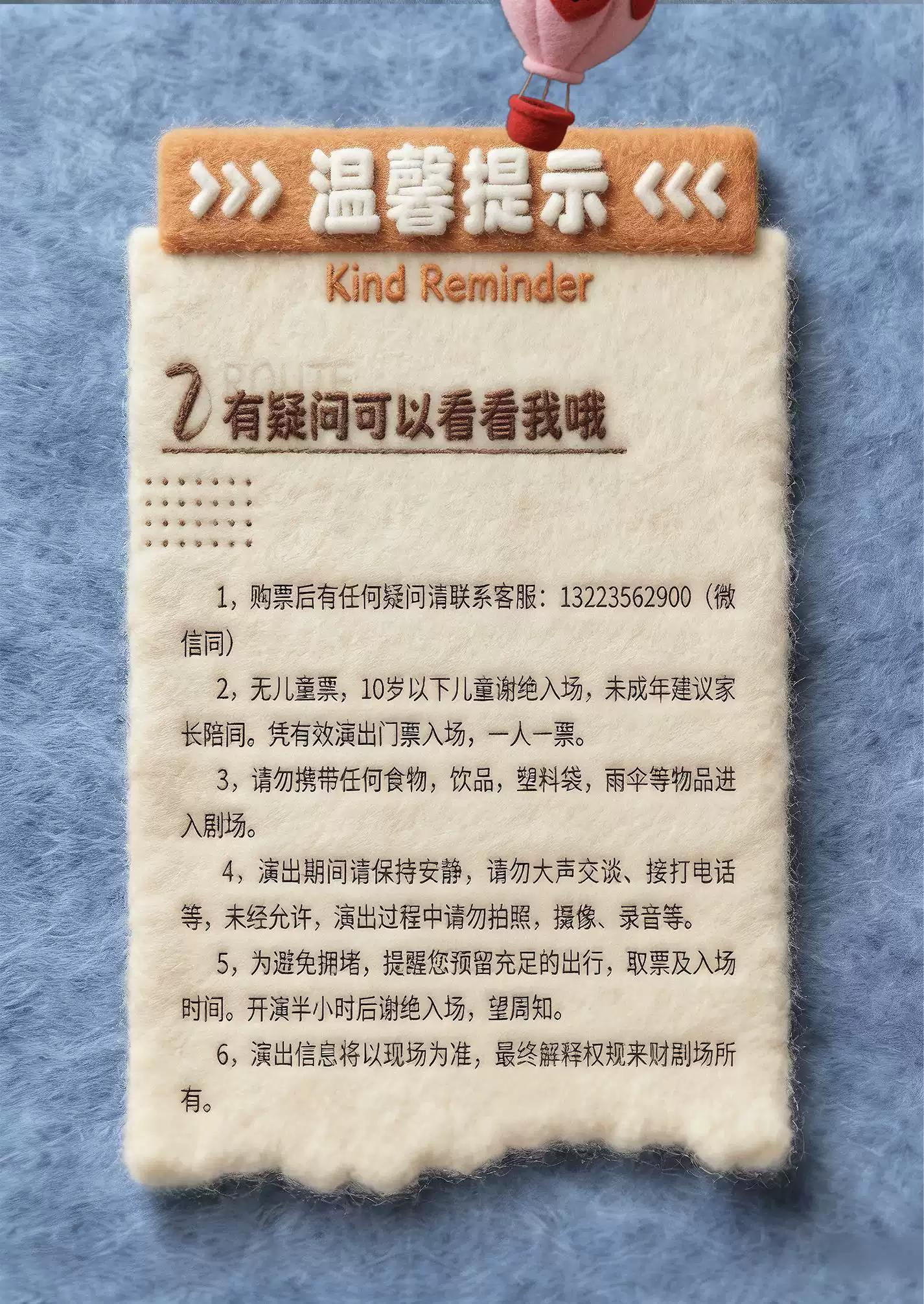 | 座位类型 | 请按门票对应座位,有序对号入座 | 儿童入场提示 | 10岁以下儿童谢绝入场 |