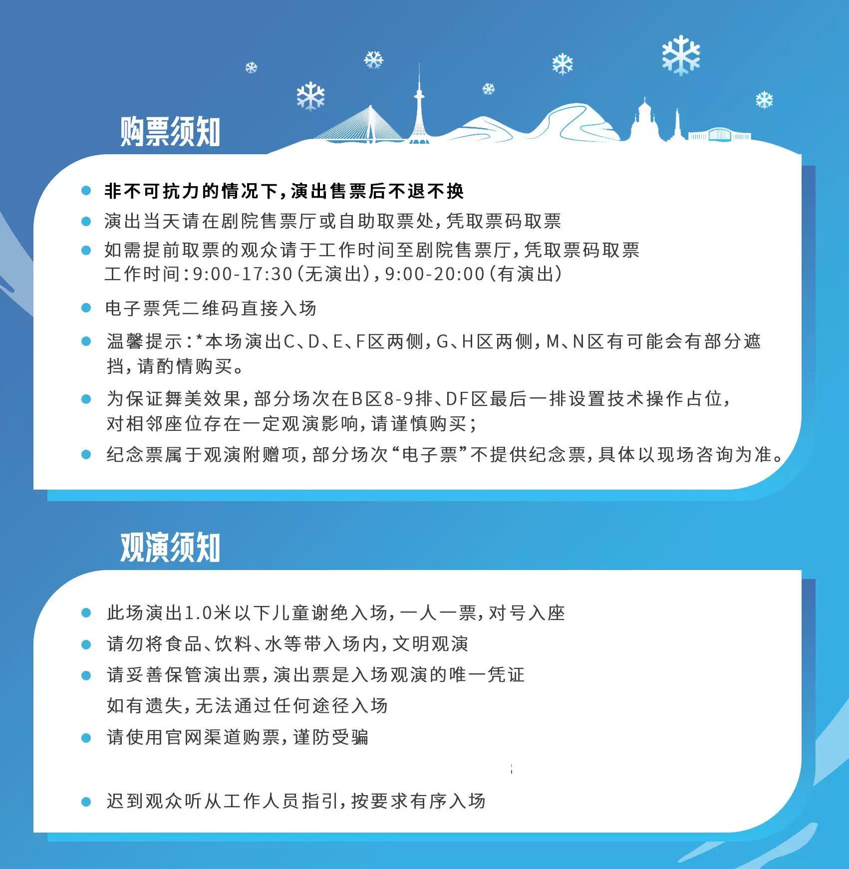 | 重要提示 | 演出现场气氛热烈,请您务必根据自身身体状况酌情是否购票参与观演,特别是患有心脏类疾病、急性心脑血管疾病、心肌炎、高血压等相关疾病的人群,请您务必遵照医嘱,结合病史及个人身体状况进行观演,观演期间请自行承担身体健康相关责任。 | 温馨提示 | 购买前请您提前规划好行程,做好相应准备,以免影响您的正常观演,感谢您的理解和配合。 若演出受不可抗力影响延期或取消,票牛将对演出票订单按照项目官方通知方案进行处理,其他因观演发生的费用需由您自行承担。 |