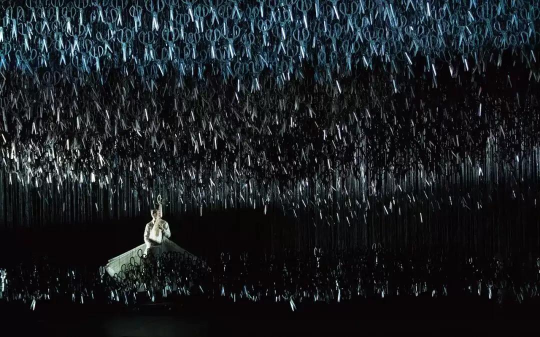 剪刀,在中国遥远的古代甚至是一种巫器,人们认为它具有辟邪以及铲除妖魔鬼怪的作用,所以剪刀的装置暗含着宿命、注定等言外之意。万把剪刀悬于舞台,刀刃指向地板,寒光闪烁,形成一片颇有声势的乌云,让人不寒而栗。剪刀,如同沉重的咒语,隐喻着恐惧、不安和暴力,有大祸临头的压迫感。剪刀也是拔剑对峙的项羽刘邦,形成了楚汉相争的形象符号。有些伤害就像剪刀一样,看似普通,其实难测,有些集体无意识就像剪刀一样,看似无害,其实遗祸千年。剪刀,就像是人人头上悬着的达摩克里斯之剑。剧中悬于舞台上方的万把剪刀,来源于华裔艺术家刘北立的装置艺术,表现着面对危险人类的单薄无力和内心深层次的恐惧。