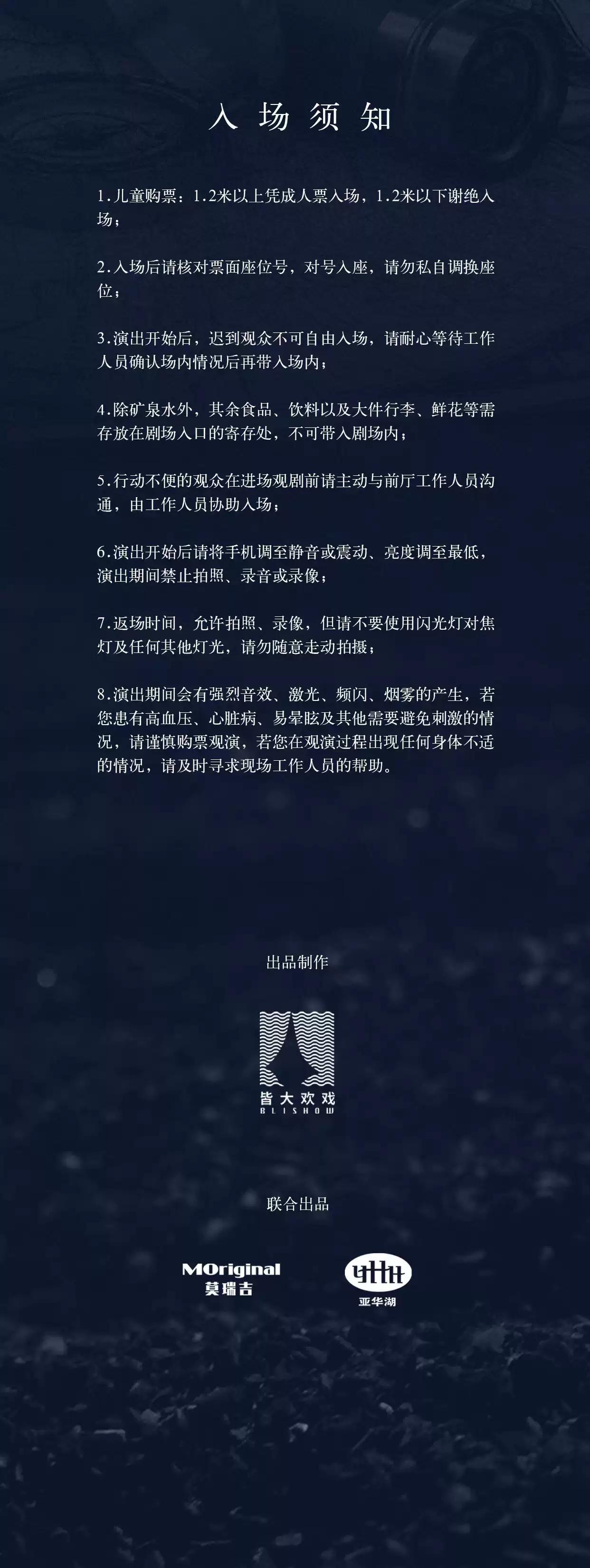 | 座位类型 | 请按门票对应座位,有序对号入座 | 儿童入场提示 | 1.2米以上凭票入场,1.2米以下谢绝入场 |