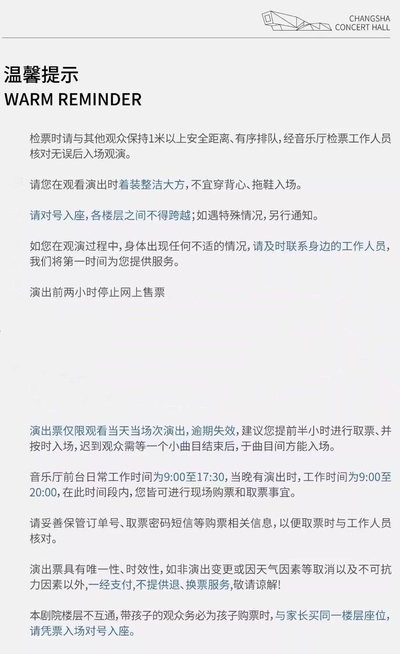 | 电子票 | 本项目支持凭电子票入场。 -请至少提前一天购买,开演前24小时内,票牛会发送取票短信,请按短信提示内容取票。 |