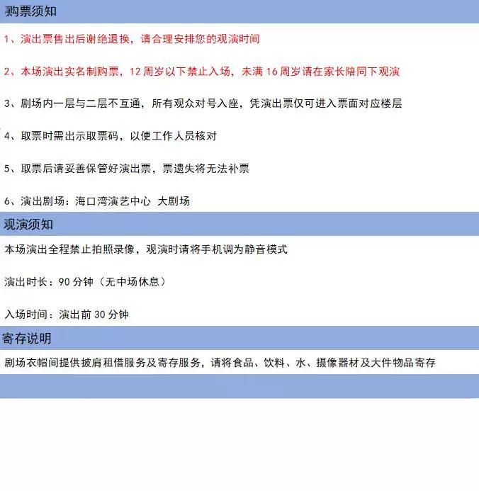 | 儿童入场提示 | 本场演出实名制购票,12周岁以下禁止入场,未满16周岁请在家长陪同下观演 | 禁止携带物品 | 食品、饮料、相机、充电宝、打火机等 |