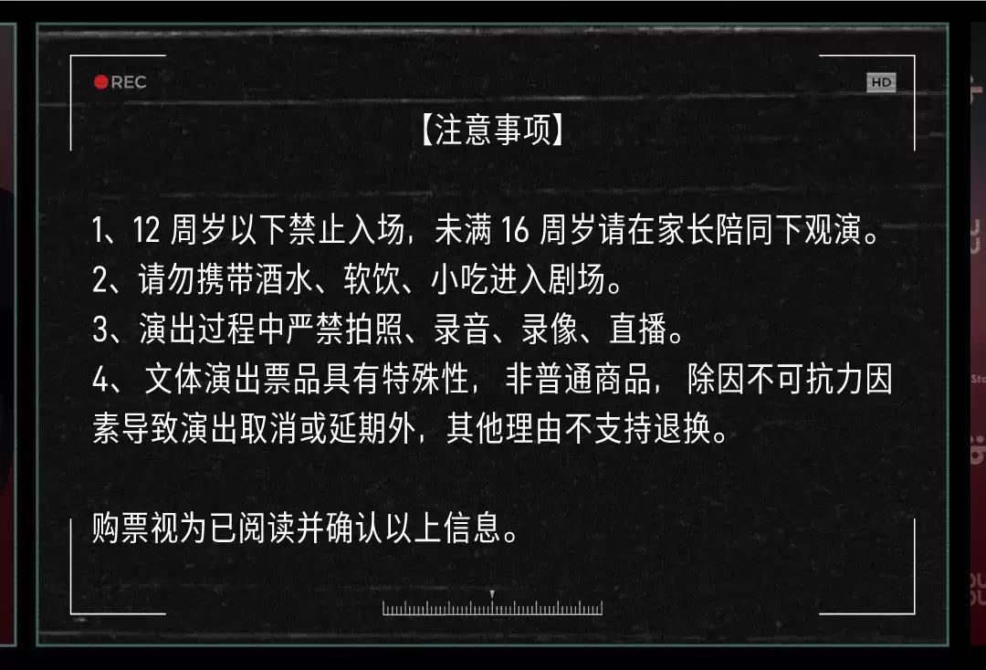 | 儿童入场提示 | 12周岁以下禁止入场,未满16周岁请在家长陪同下观演 | 禁止携带物品 | 食品、饮料、相机、充电宝、打火机等 |